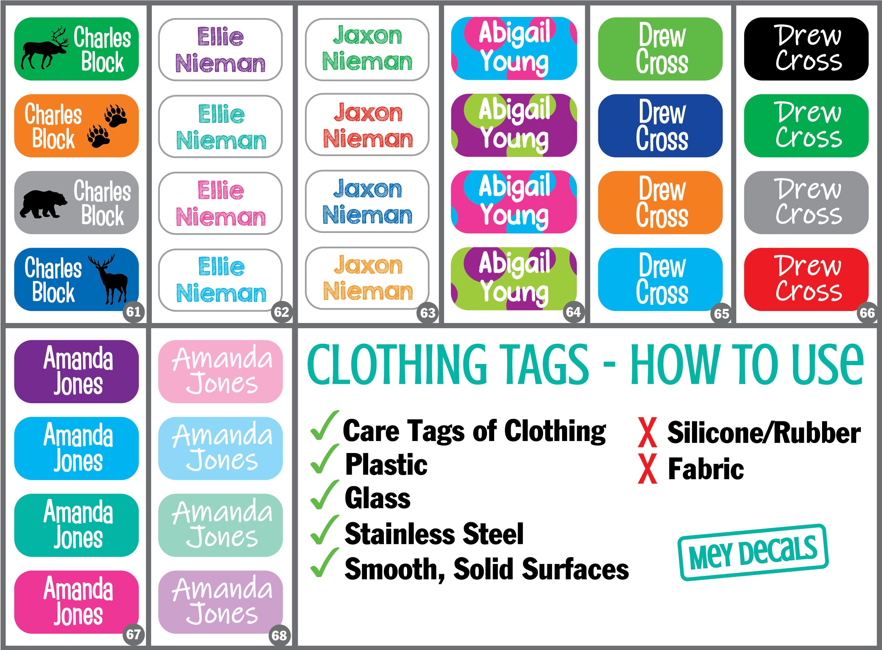{ADD-ON} – 60 MINI-ETIKETTEN (Nicht für Kleidung), Abmessungen/Verwendung wie auf den Fotos gezeigt. – 40 STANDARD-ETIKETTEN (Nicht für Kleidung), Abmessungen/Verwendung wie auf den Fotos gezeigt. – 48 BÜGELETIKETTEN (Für Kleidung), Abmessungen/Verwendung wie auf den Fotos gezeigt.