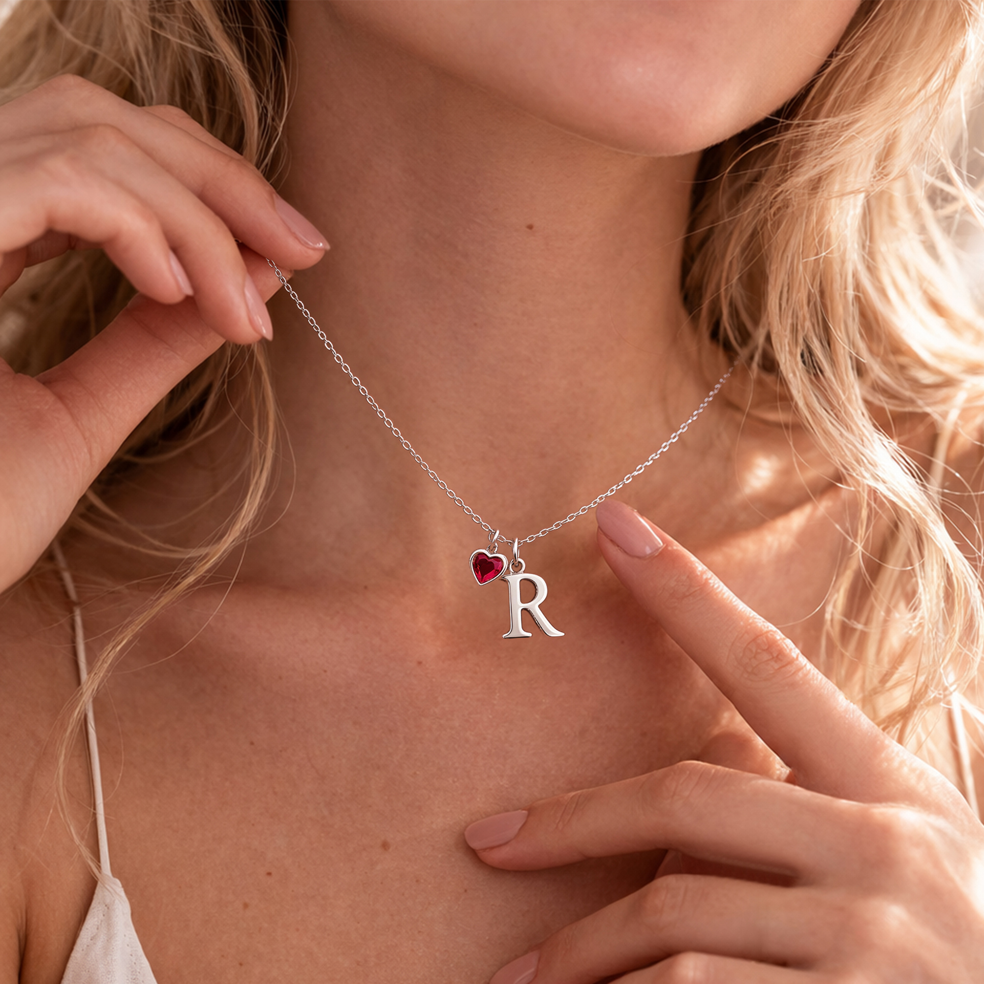 Personalisiert & Bedeutungsvoll – Diese zarte Halskette besticht durch einen kleinen Buchstabenanhänger und einen herzförmigen Geburtsstein. Personalisieren Sie sie mit dem Anfangsbuchstaben ihres Namens oder einem anderen bedeutungsvollen Buchstaben, der Liebe und Individualität symbolisiert.