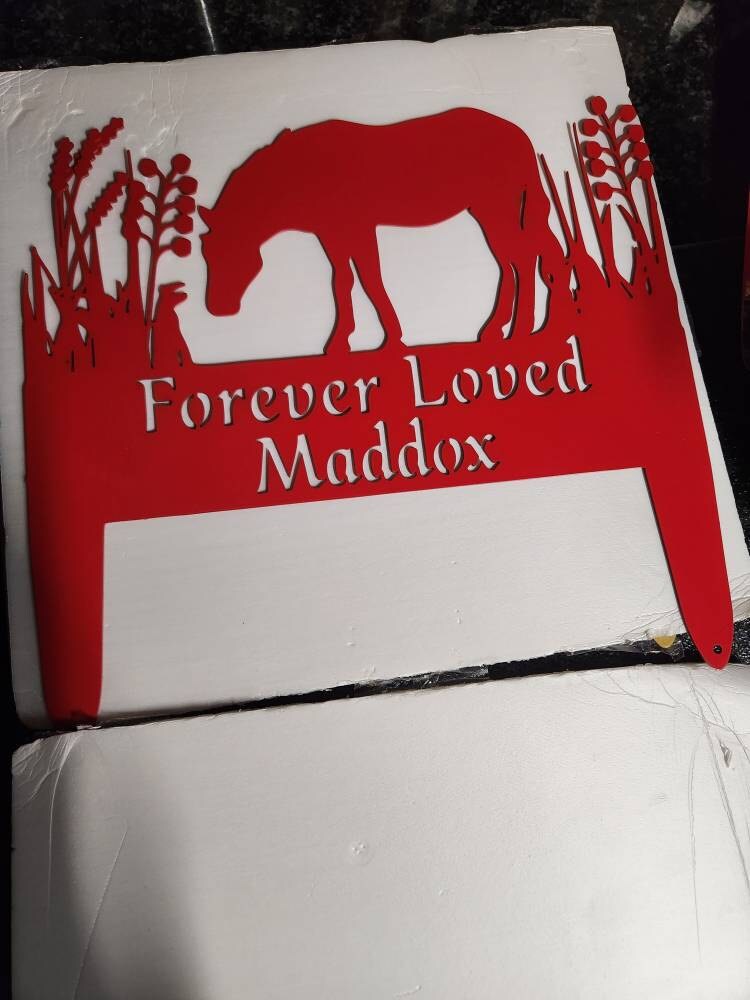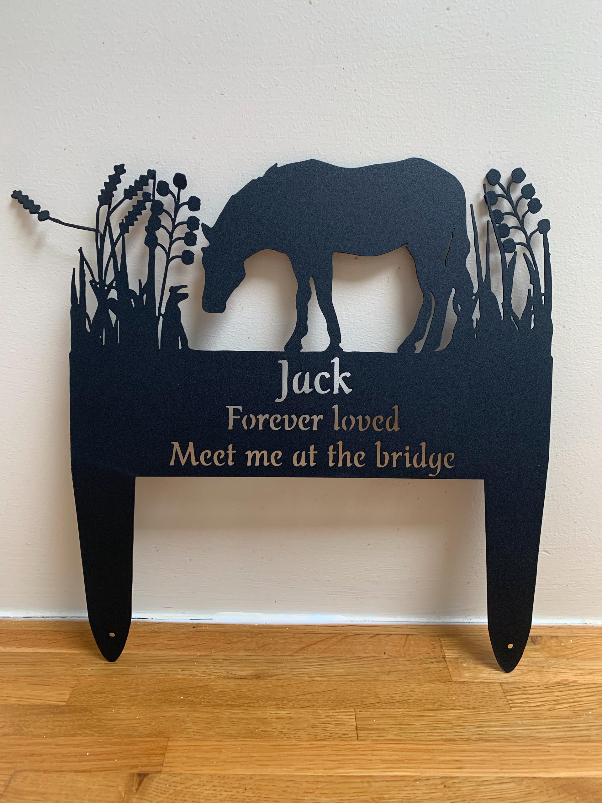 So wie Ihr Pferd voller Kraft und Anmut war, ist dieser Gedenkpfahl maßgeschneidert, um seine einzigartige Präsenz widerzuspiegeln. Lasergeschnitten aus robustem Metall und pulverbeschichtet für dauerhafte Qualität, trotzt er den Elementen – denn wir alle wissen, dass Ihrem Pferd ein bisschen Regen oder Schlamm nie etwas ausmachte, wenn das Abenteuer rief!
