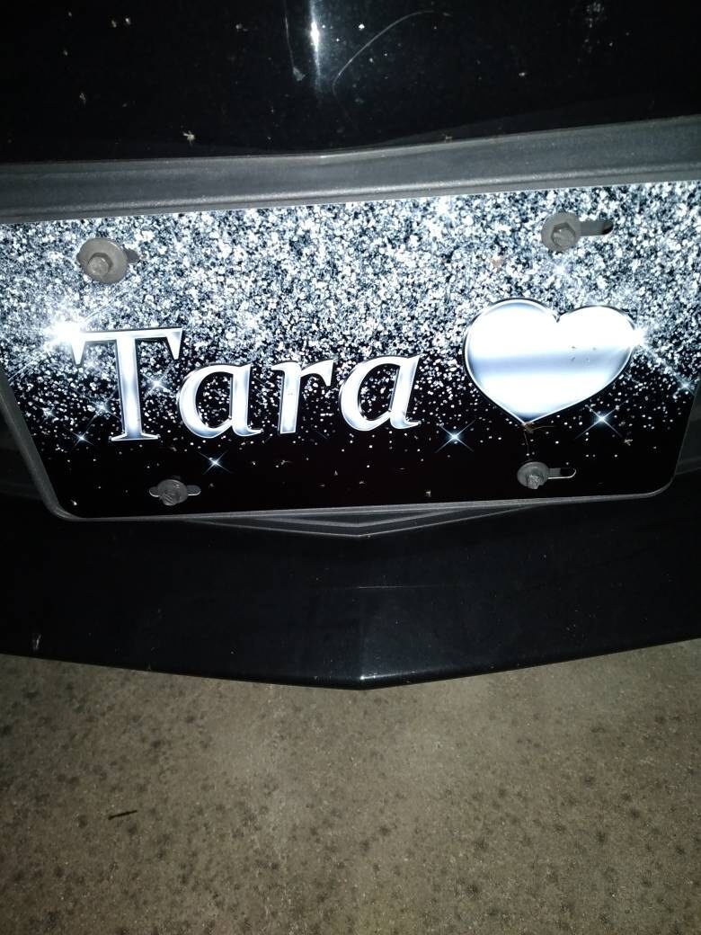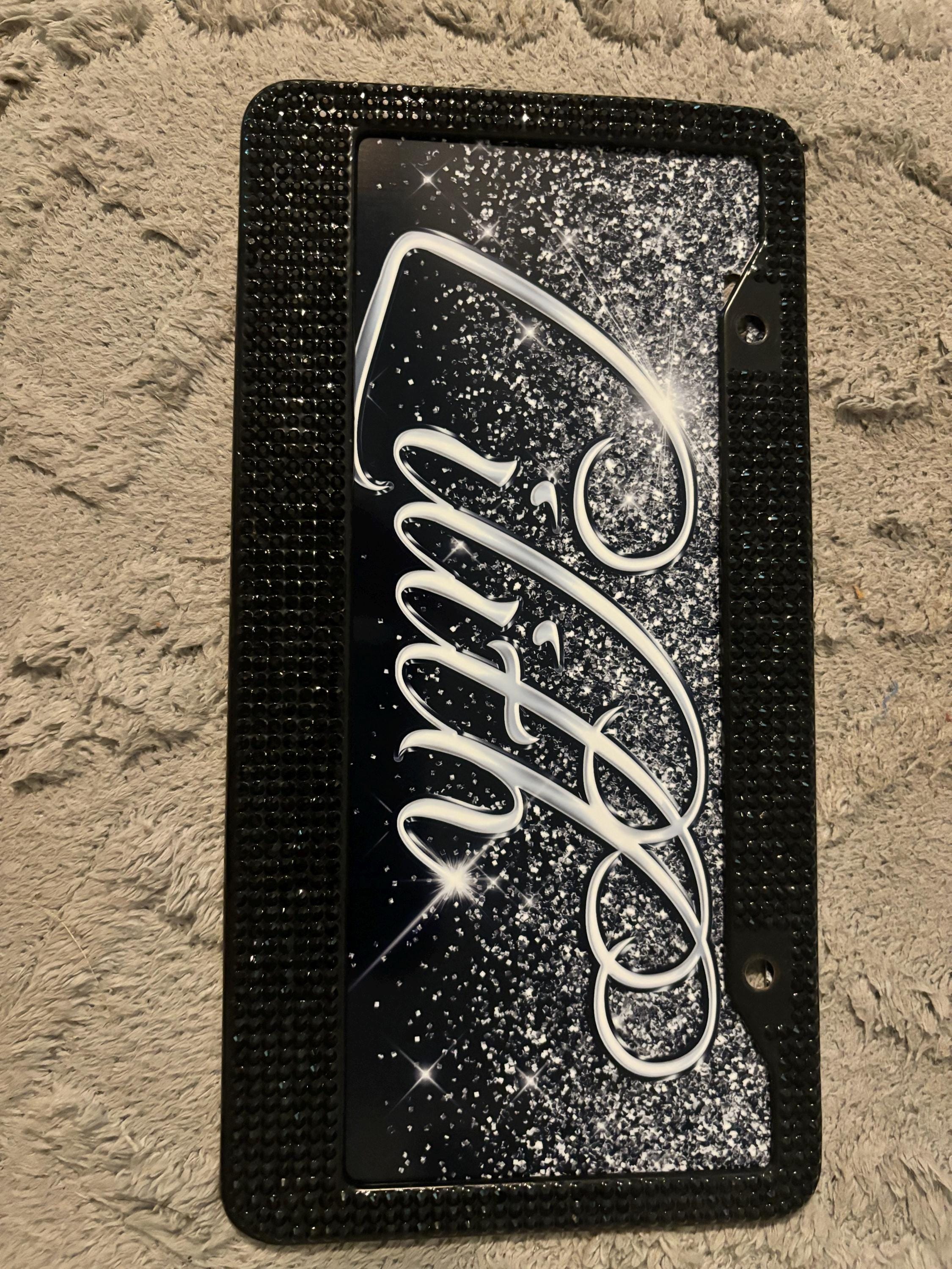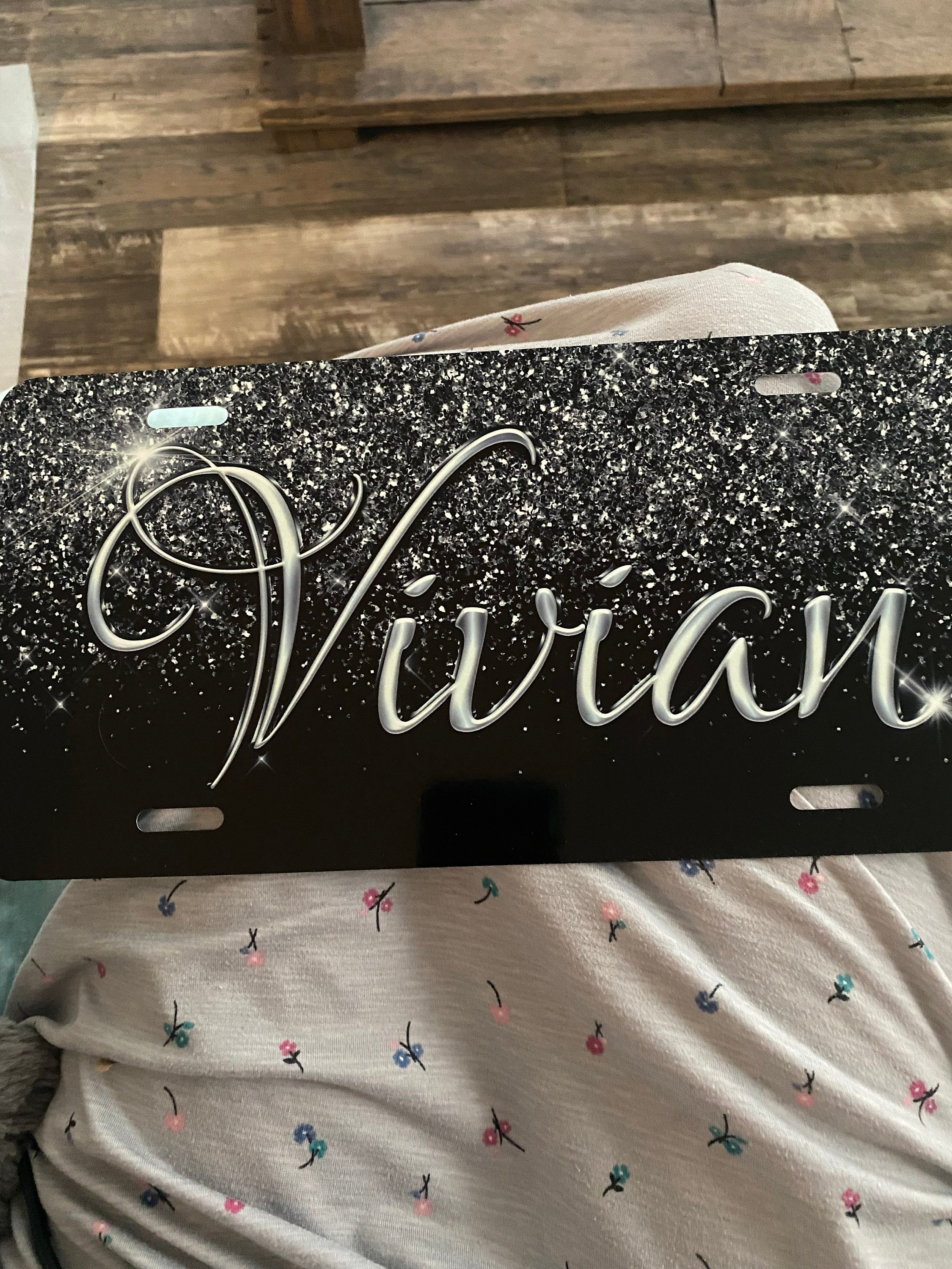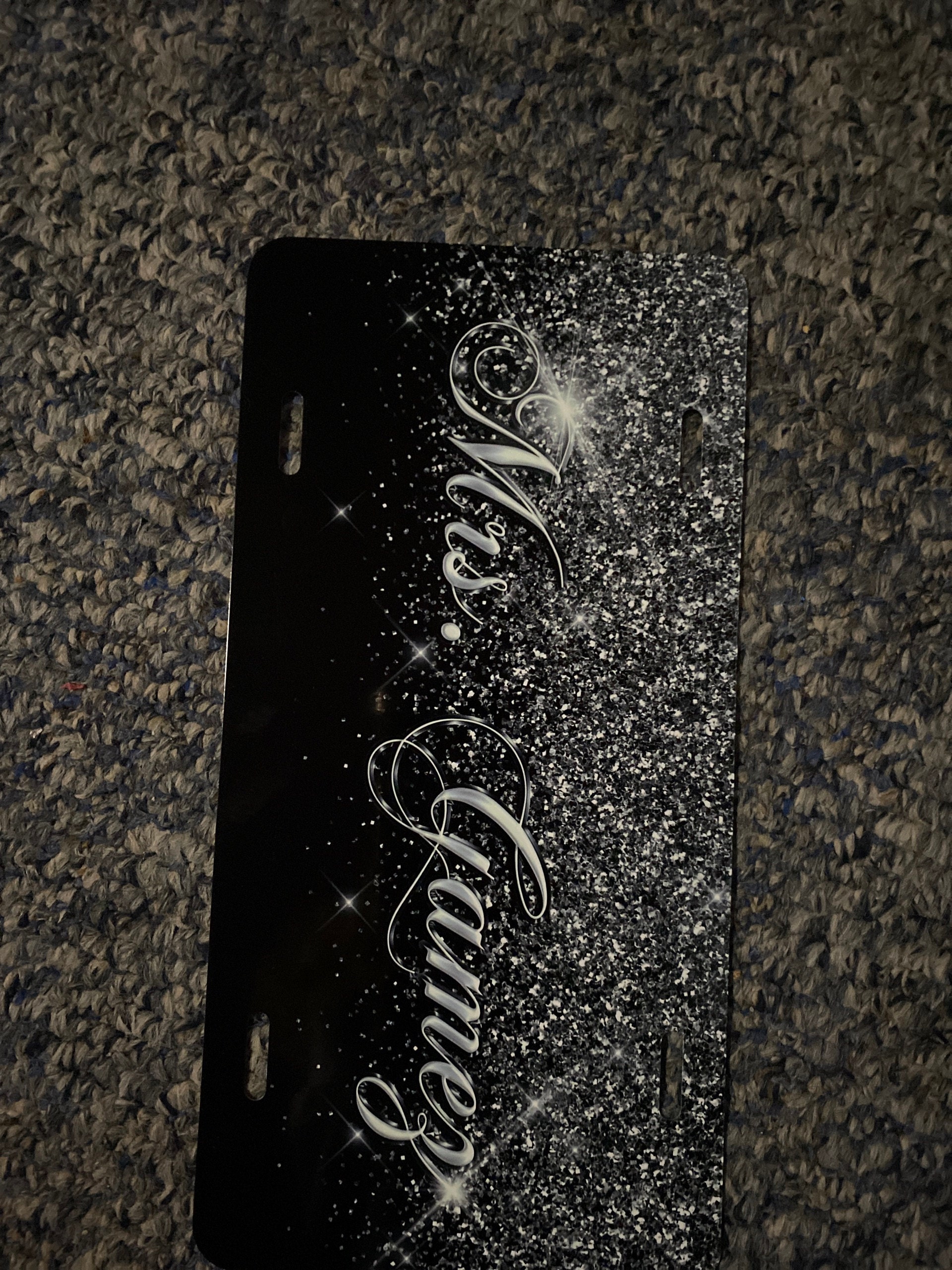 Ein schwarzes Nummernschild mit silbergrauem Glitzer (KEIN ECHTER GLITZER) und Ihrem Text/einem beliebigen Namen.