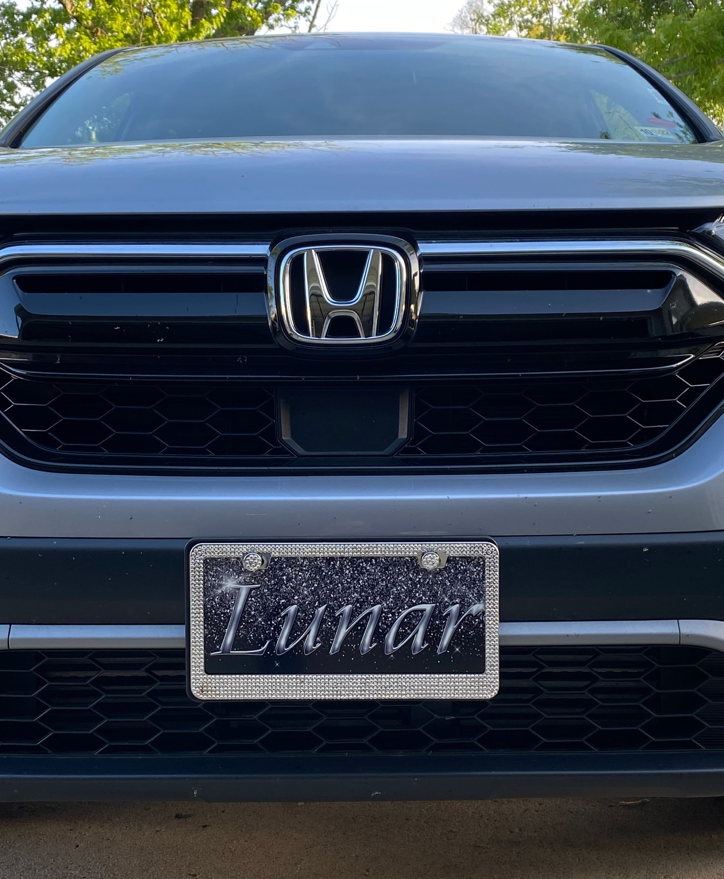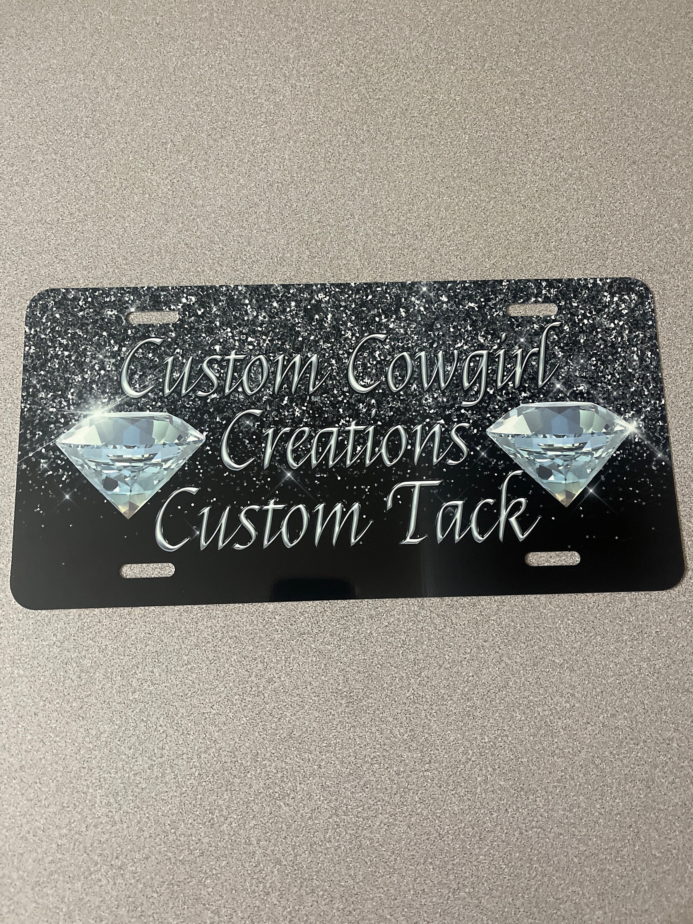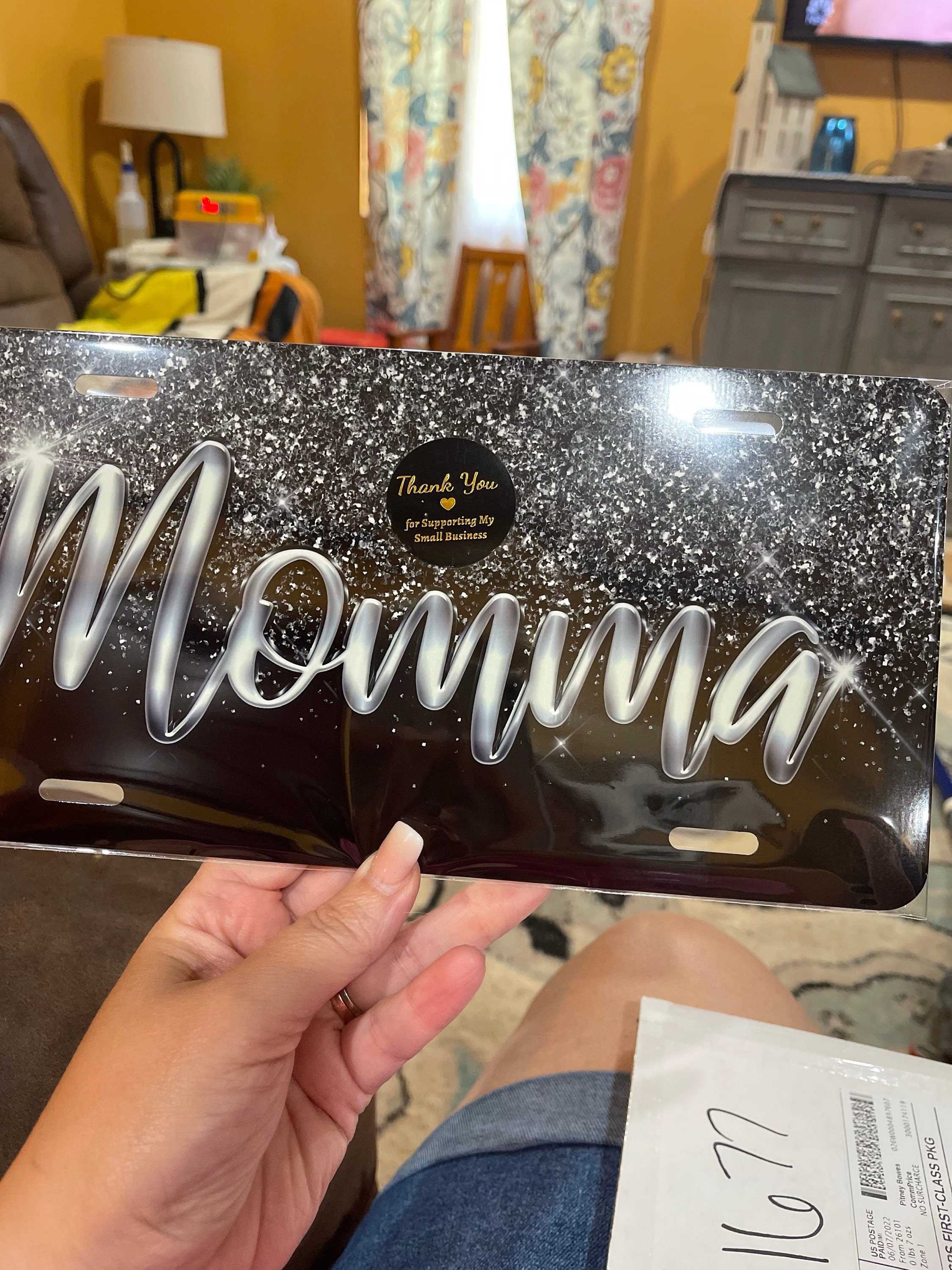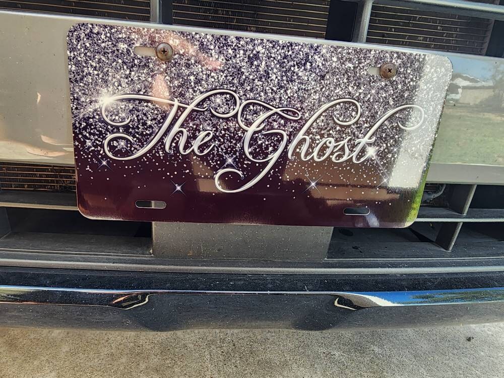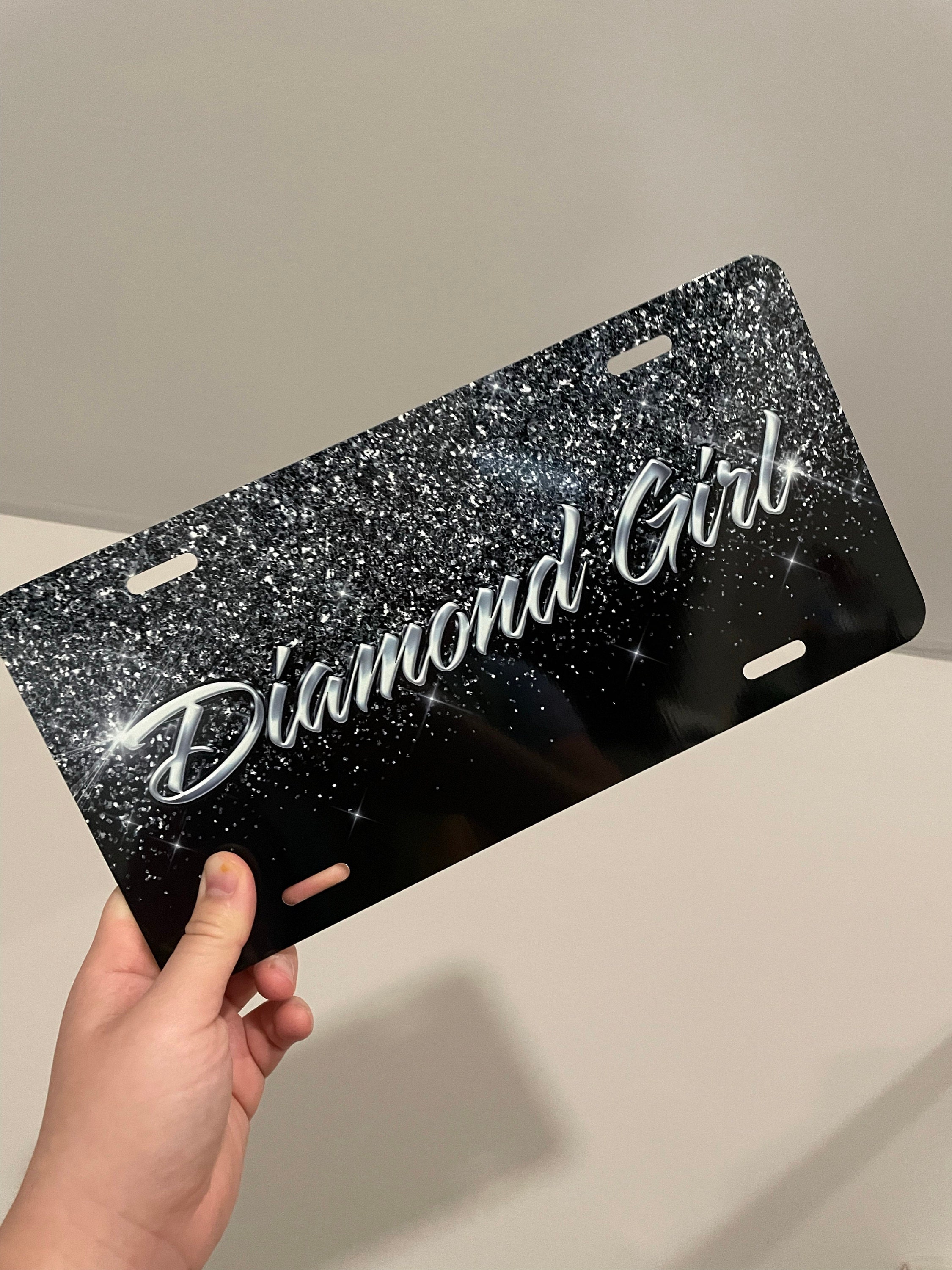 Ein schwarzes Nummernschild mit silbergrauem Glitzer (KEIN ECHTER GLITZER) und Ihrem Text/einem beliebigen Namen.