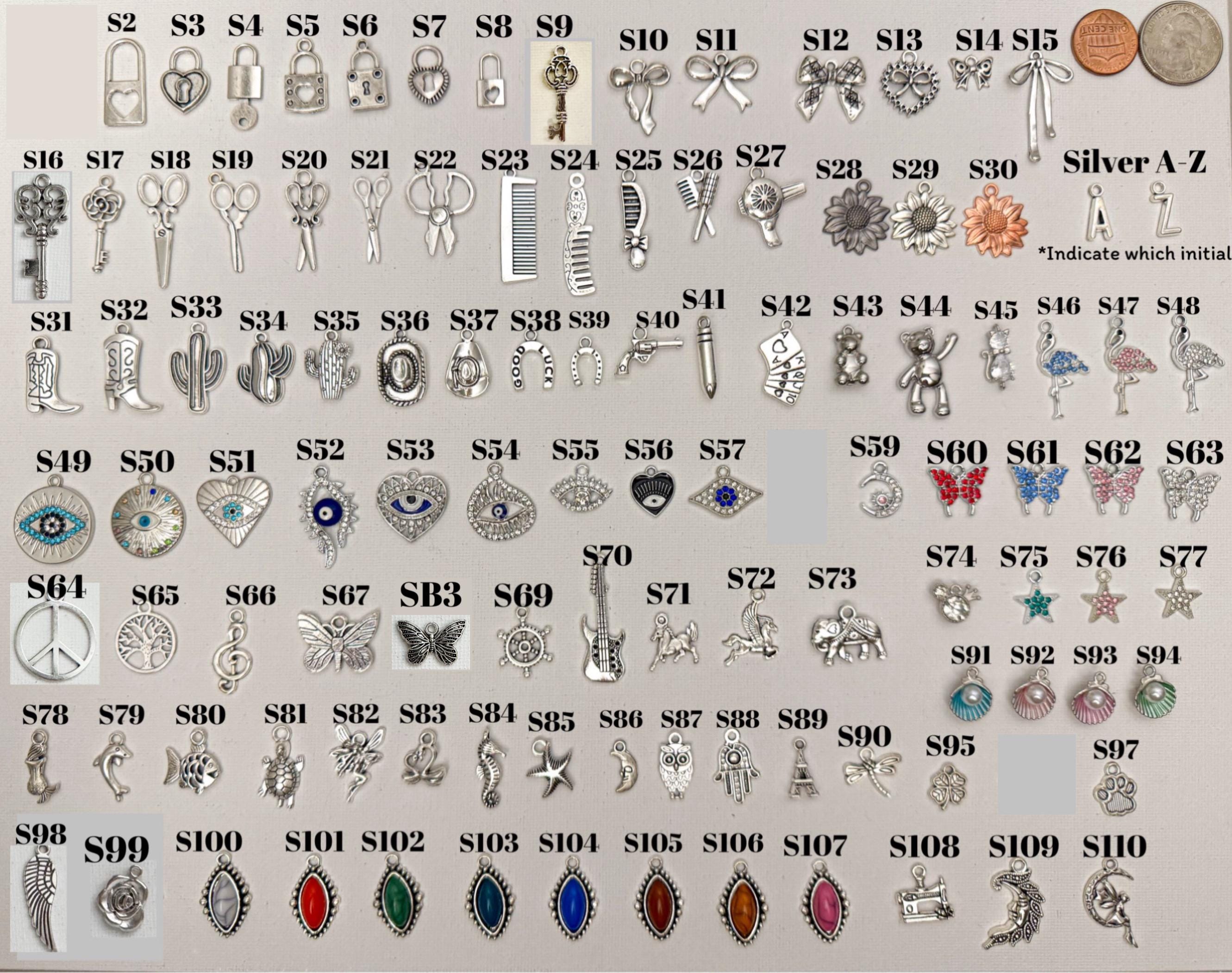 3. Personalisierung hinzufügen. Geben Sie die Zahlen/Buchstaben Ihrer Lieblingsanhänger durch Komma getrennt ein. Alle Anhänger sind ÜBER dem Anhänger nummeriert. (Beispiel: S1, W1, S67, S55, S3)