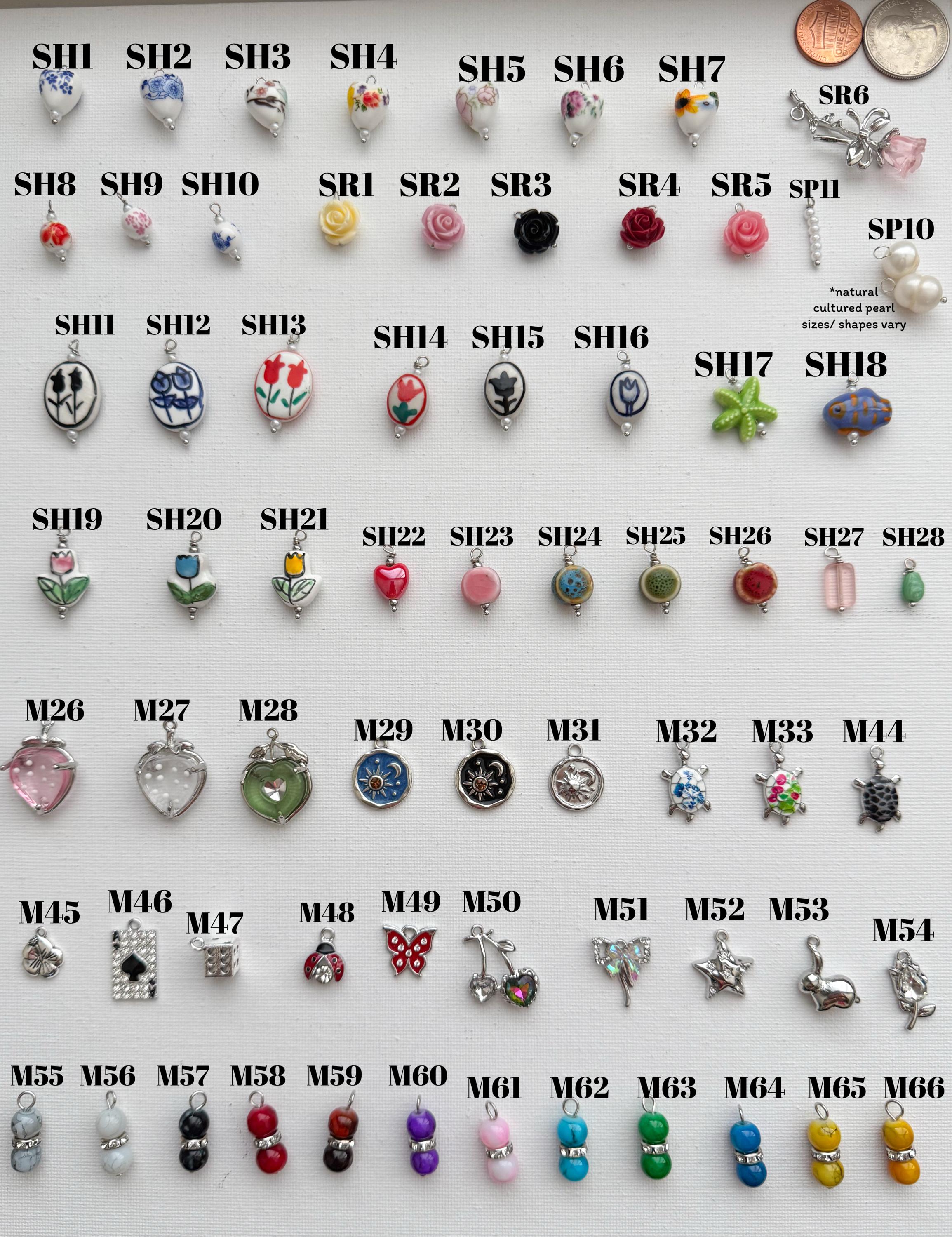 Anhänger: Die Materialien der Anhänger variieren je nach Anhänger und umfassen Legierung, Zink, legierten Stahl, Messing, Glas, Edelstahl, Emaille, Harz, Acryl, Zuchtperlen, Strass, Muscheln und Natursteine.