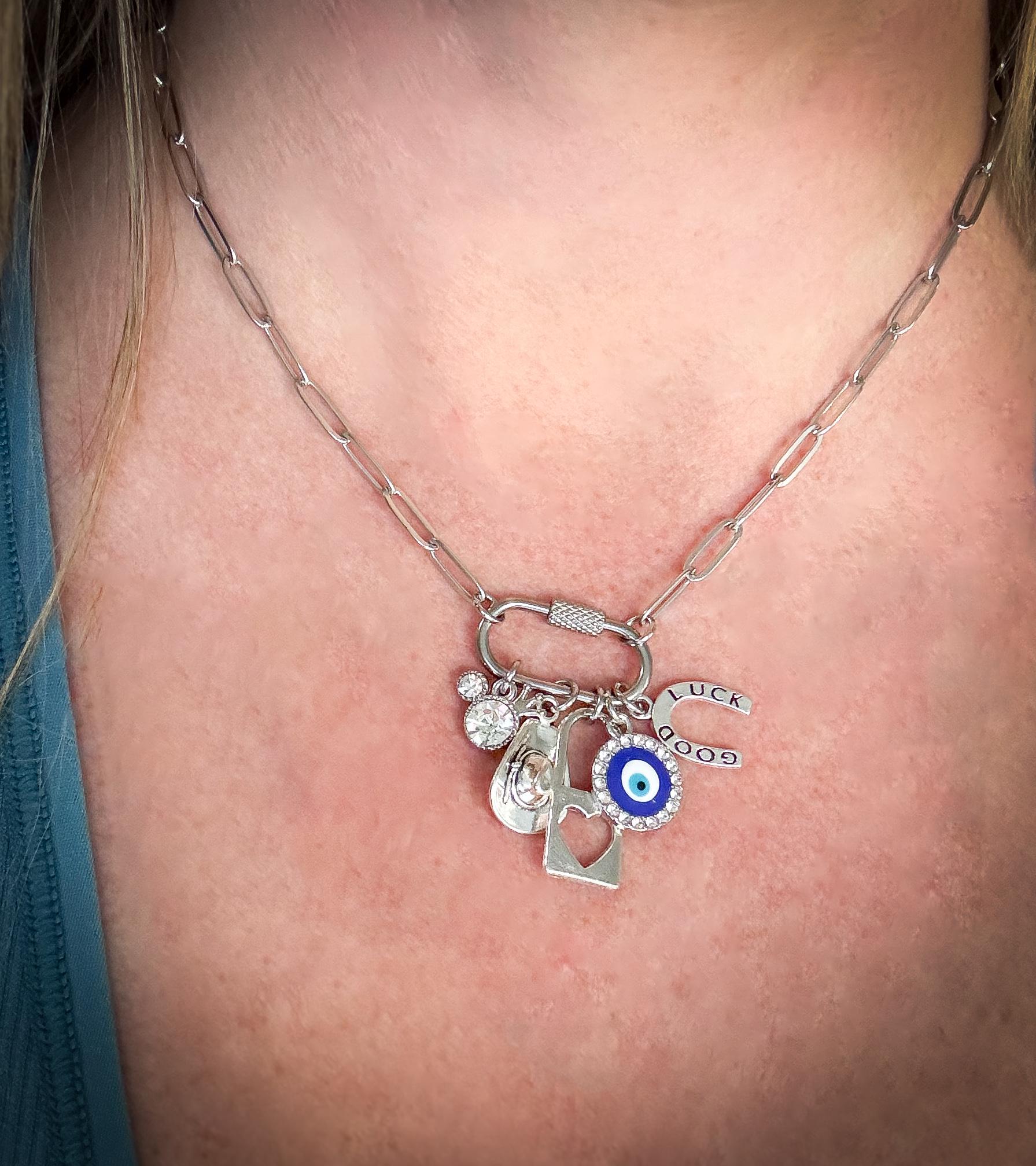 Gestalten Sie Ihre eigene, individuelle Charm-Karabinerkette aus Silber. Entdecken Sie Ihr neues Lieblingsschmuckstück! Wählen Sie Ihre Lieblings-Charms und präsentieren Sie Ihren persönlichen Stil, Ihre Interessen oder Ihre Erinnerungen! Erhältlich an einer wunderschönen Büroklammerkette aus Edelstahl. Wählen Sie so viele Charms, wie Sie möchten, und tauschen Sie sie einfach durch Öffnen des Karabiners aus. Kreieren Sie verschiedene Looks mit nur EINER Halskette! Bei der großen Auswahl an Charms ist für jeden Geschmack etwas dabei. Auch ein tolles Geschenk, das garantiert begeistert! Gestalten Sie eine einzigartige Halskette, die Sie oder ein geliebter Mensch schätzen werden. Handgefertigt, speziell für Sie.