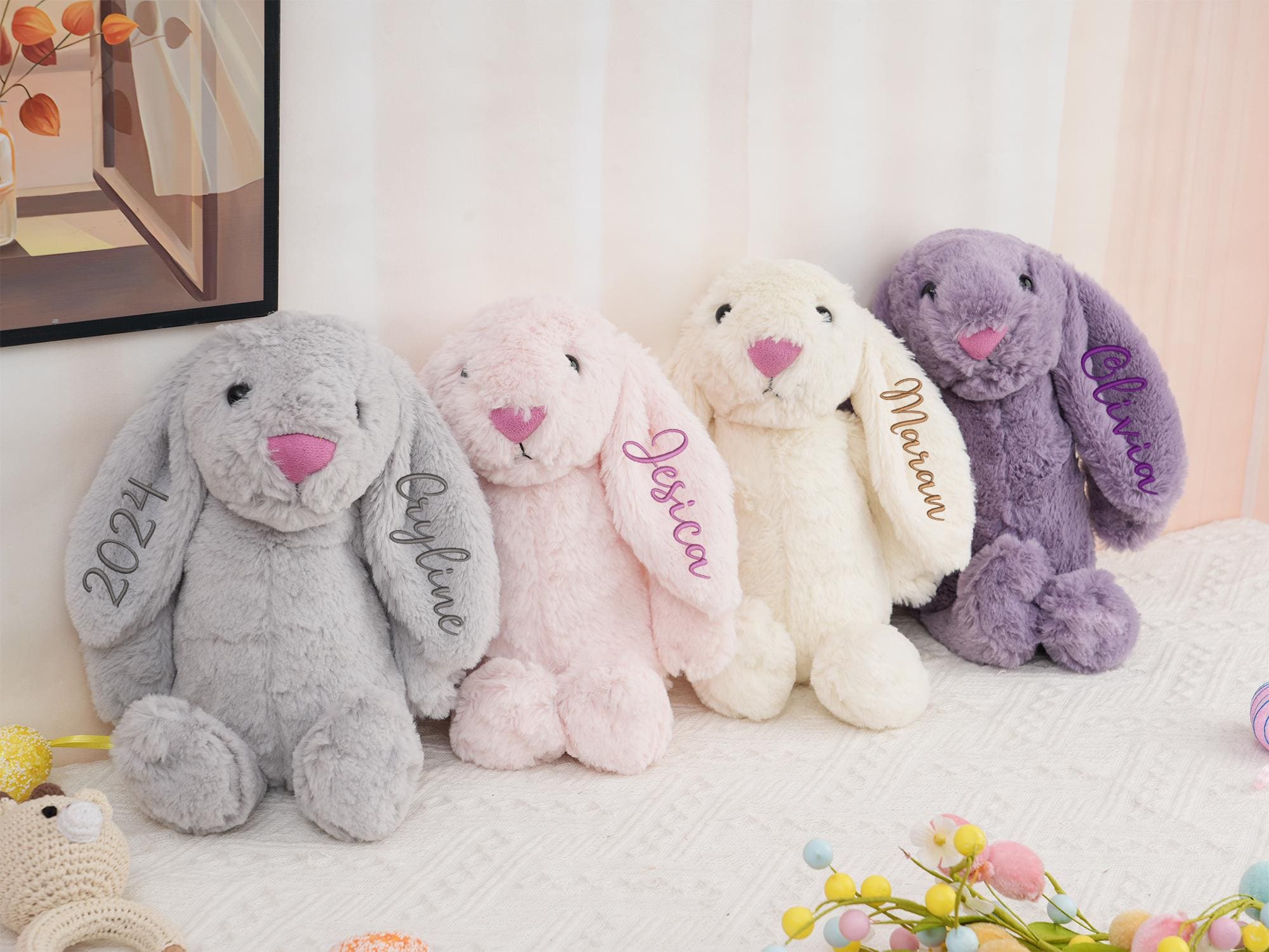 Personalisierte Plüschhasen sind speziell für Ostern konzipiert. Wenn Sie ein Geschenk suchen, das Kinder lieben werden, sind Sie hier genau richtig. Sie können die Ohren dieses süßen Hasen mit dem Namen Ihres Kindes personalisieren. Es gibt nichts Besseres als einen Plüschhasen mit Namen als Ostergeschenk.