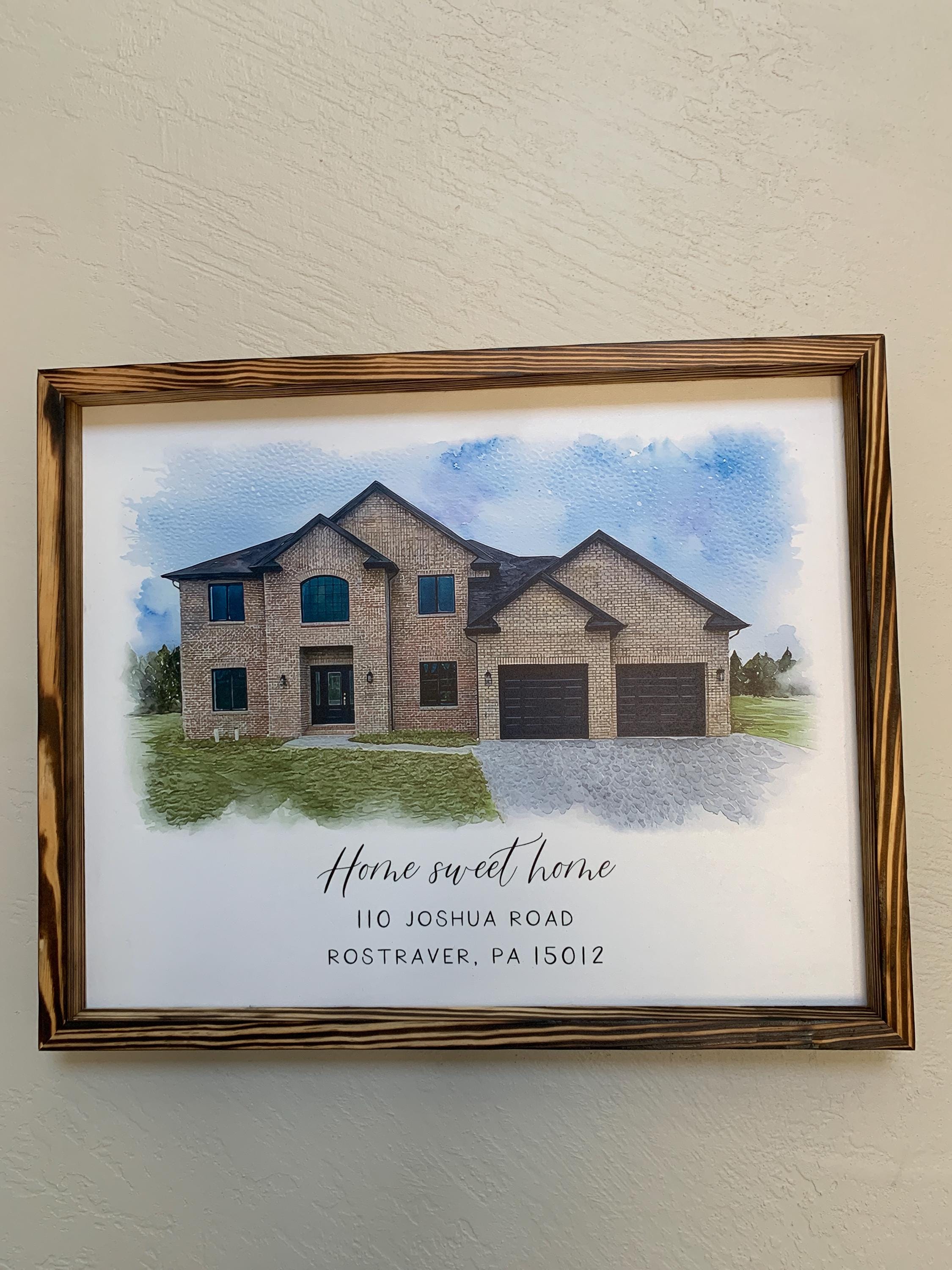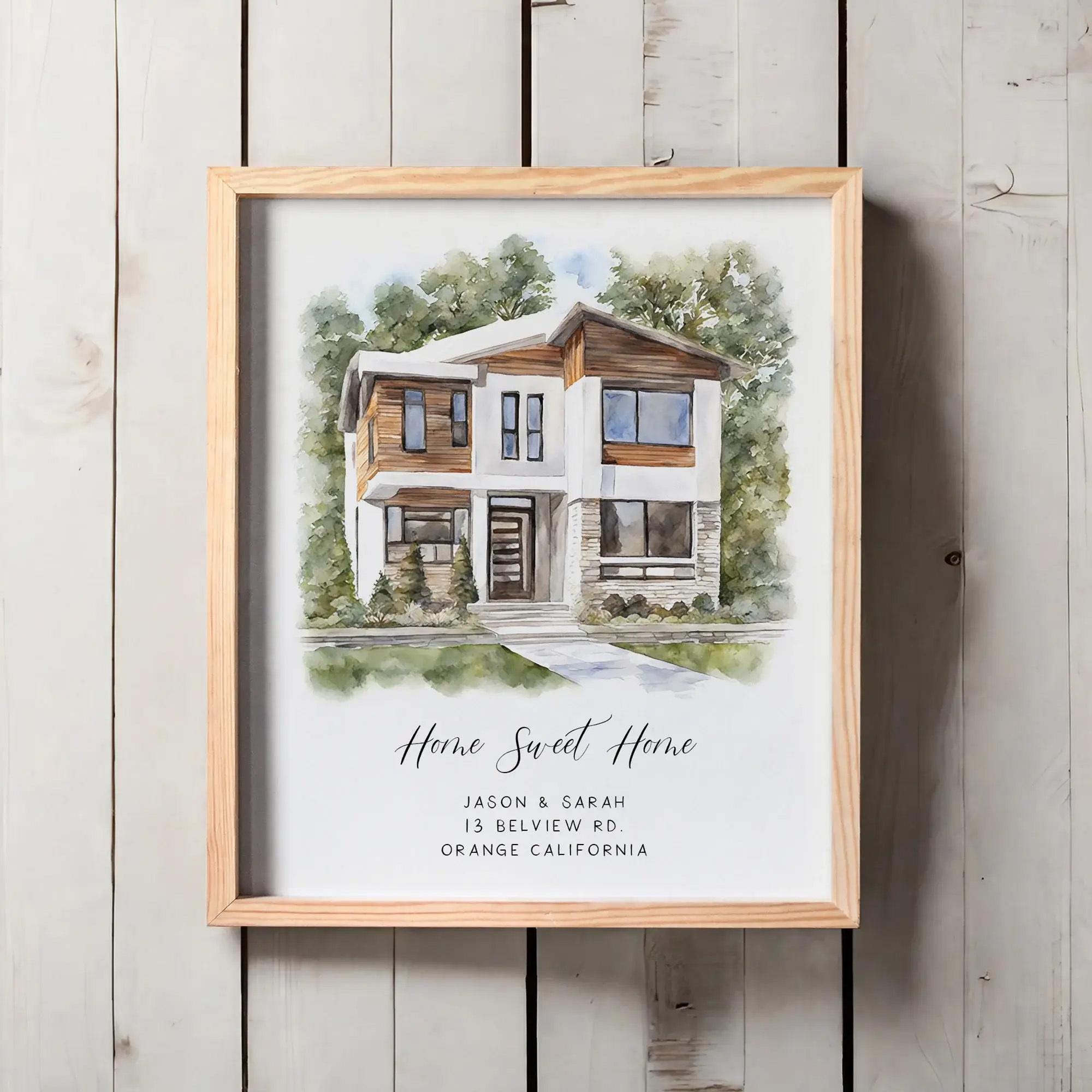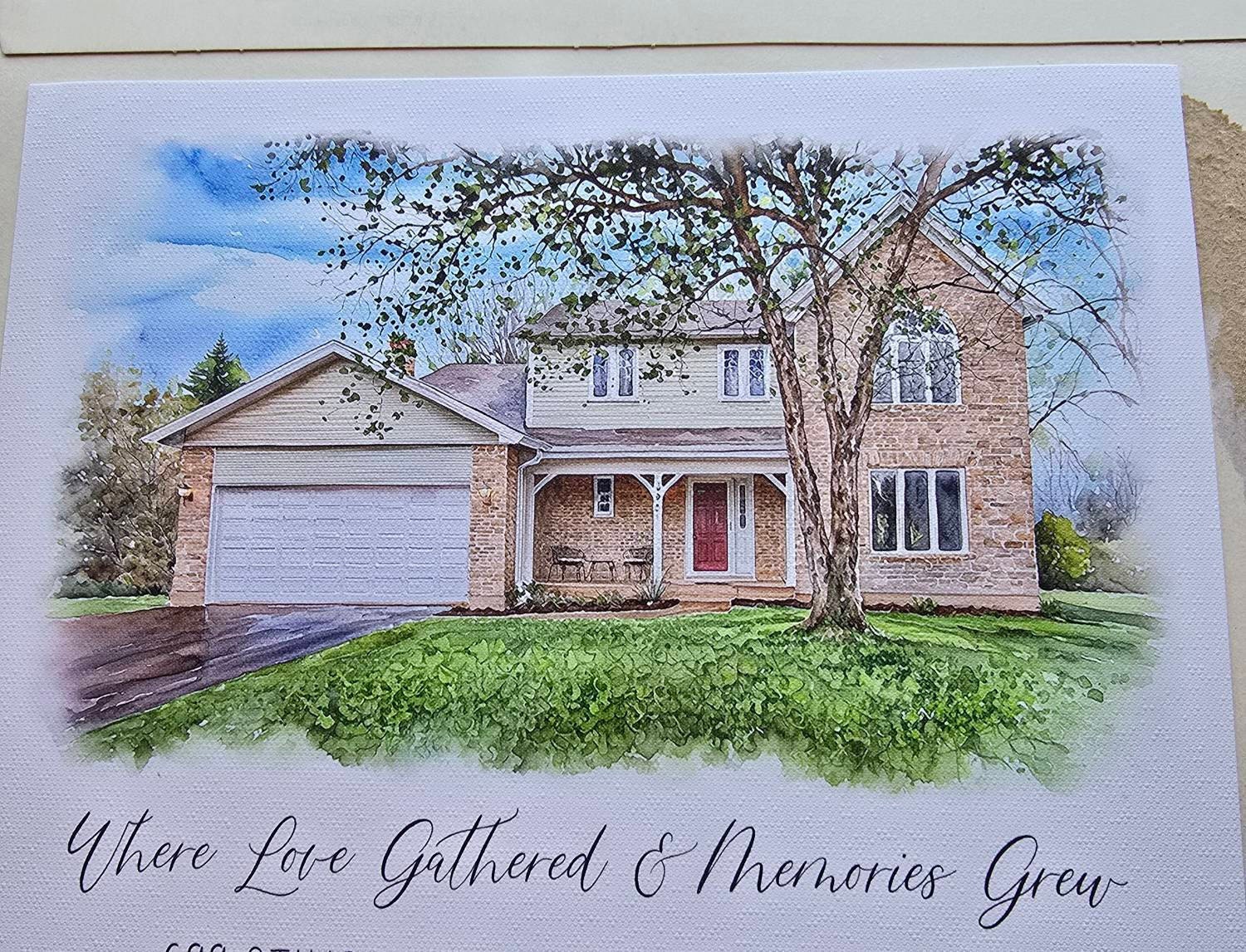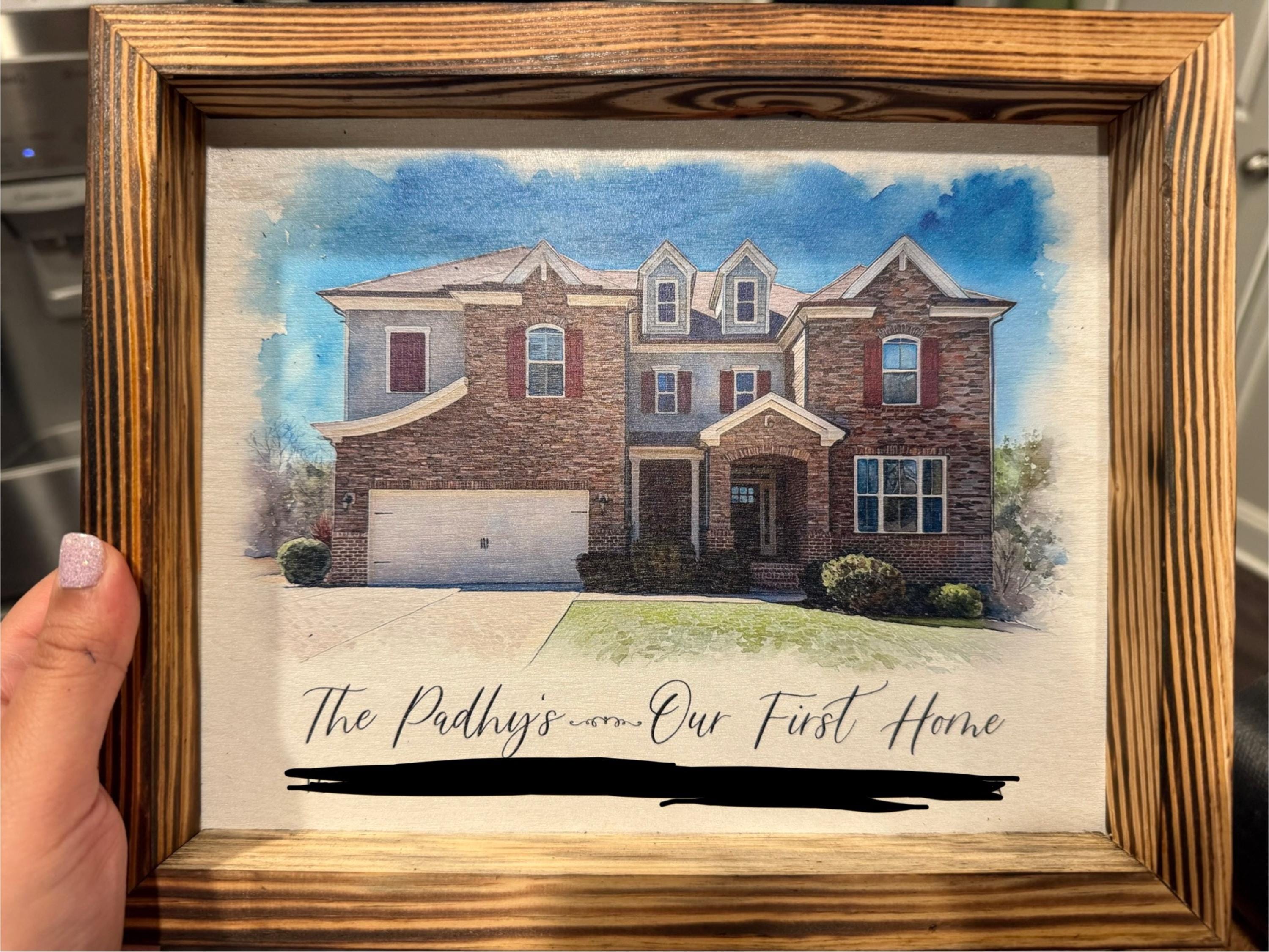 (Hausporträt, Hausmalerei, Einweihungsgeschenk, Schild „Unser erstes Zuhause“, Schild „Home Sweet Home“, Aquarell-Haus, Hausporträt, Geschenk für Immobilienmakler)