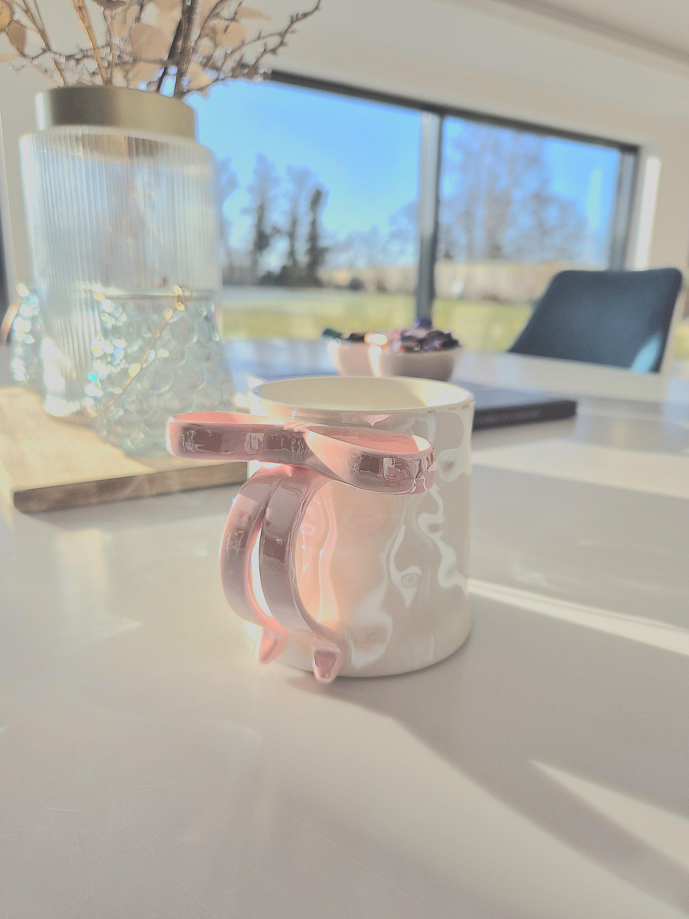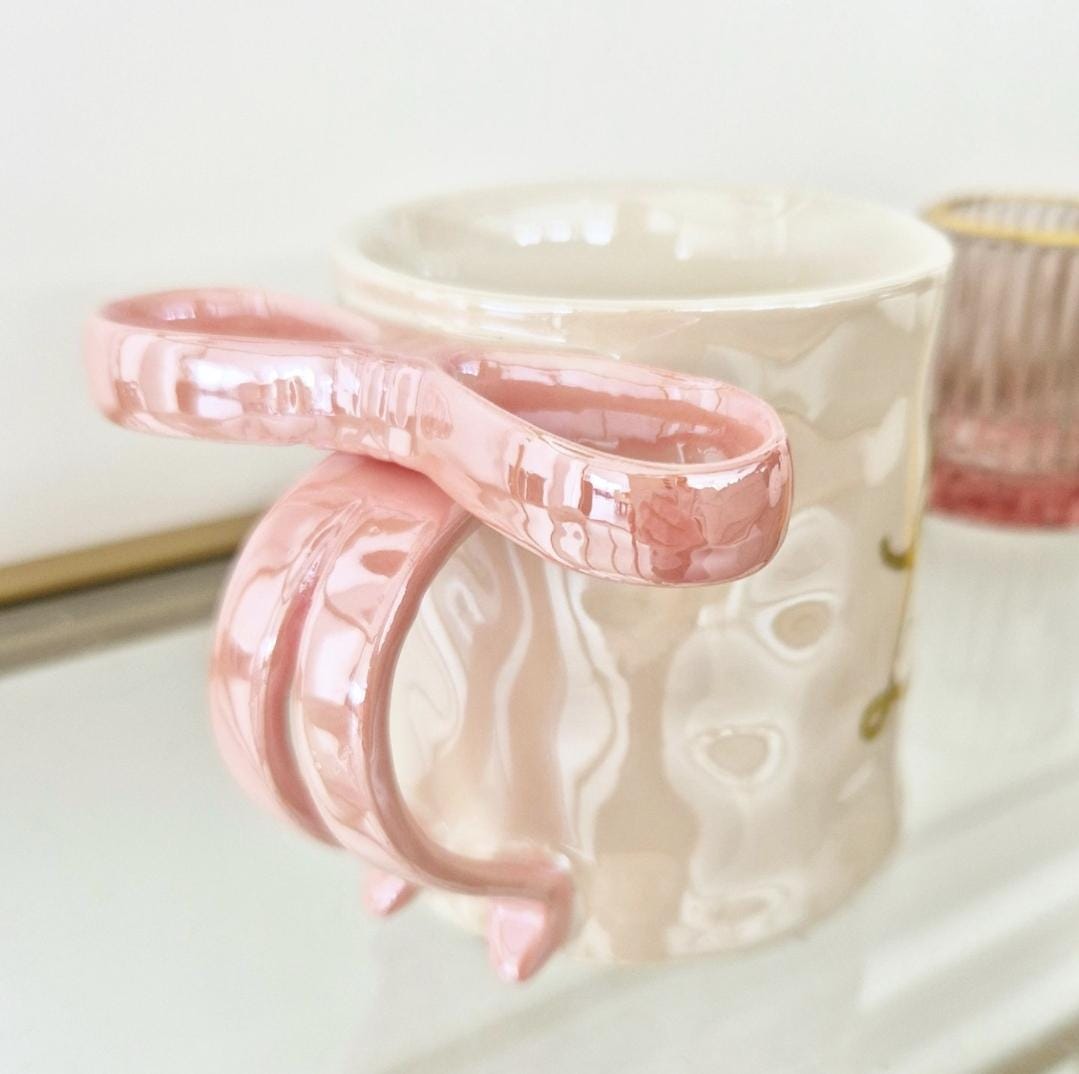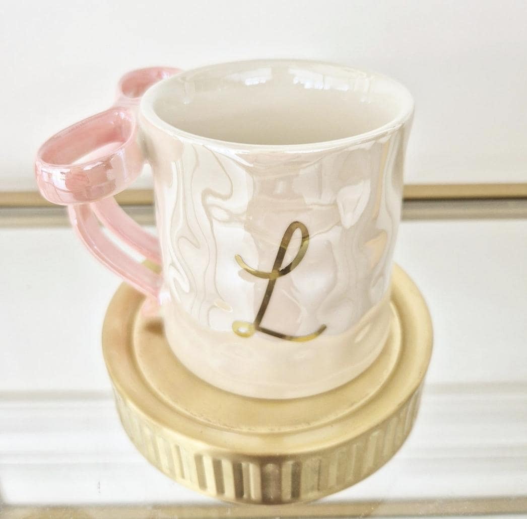 Genießen Sie stilvoll eine Tasse Tee oder Kaffee aus unseren wunderschönen Tassen mit Schleifengriff, die vollständig mit Ihrem Anfangsbuchstaben oder Namen personalisiert sind. Handgefertigt in Perlglanz mit wunderschön gearbeitetem rosa Schleifengriff wäre unsere Tasse das ideale Geschenk ????