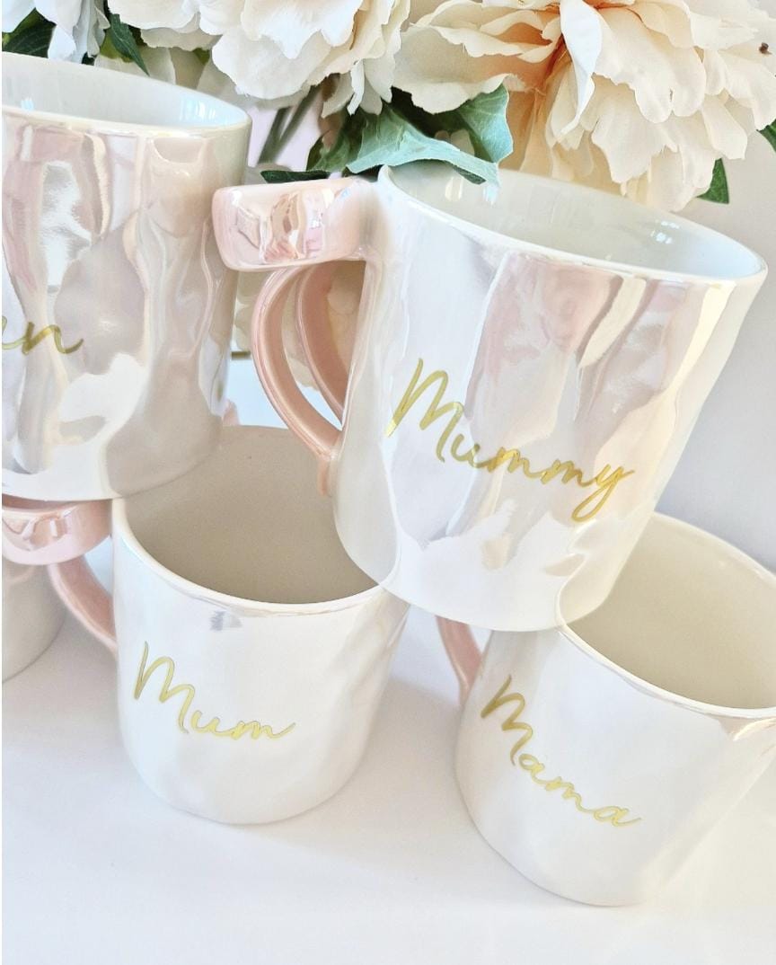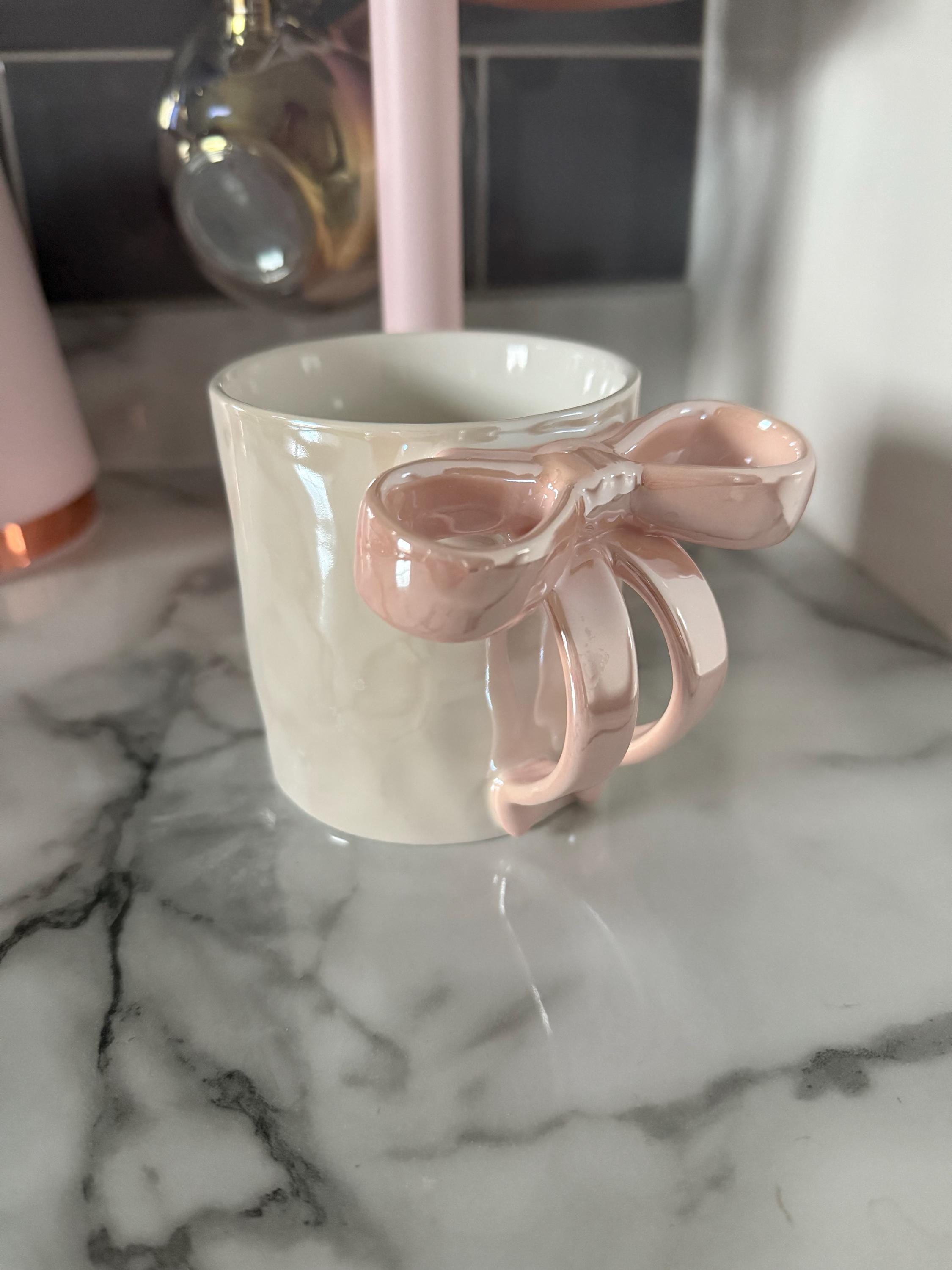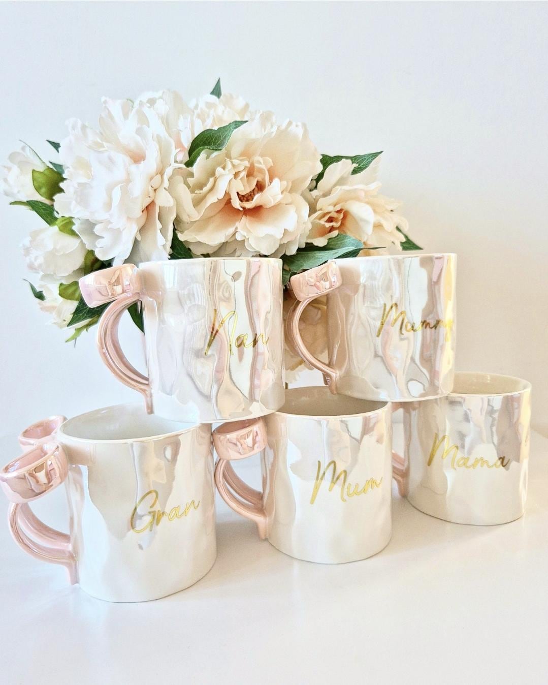 Genießen Sie stilvoll eine Tasse Tee oder Kaffee aus unseren wunderschönen Tassen mit Schleifengriff, die vollständig mit Ihrem Anfangsbuchstaben oder Namen personalisiert sind. Handgefertigt in Perlglanz mit wunderschön gearbeitetem rosa Schleifengriff wäre unsere Tasse das ideale Geschenk ????
