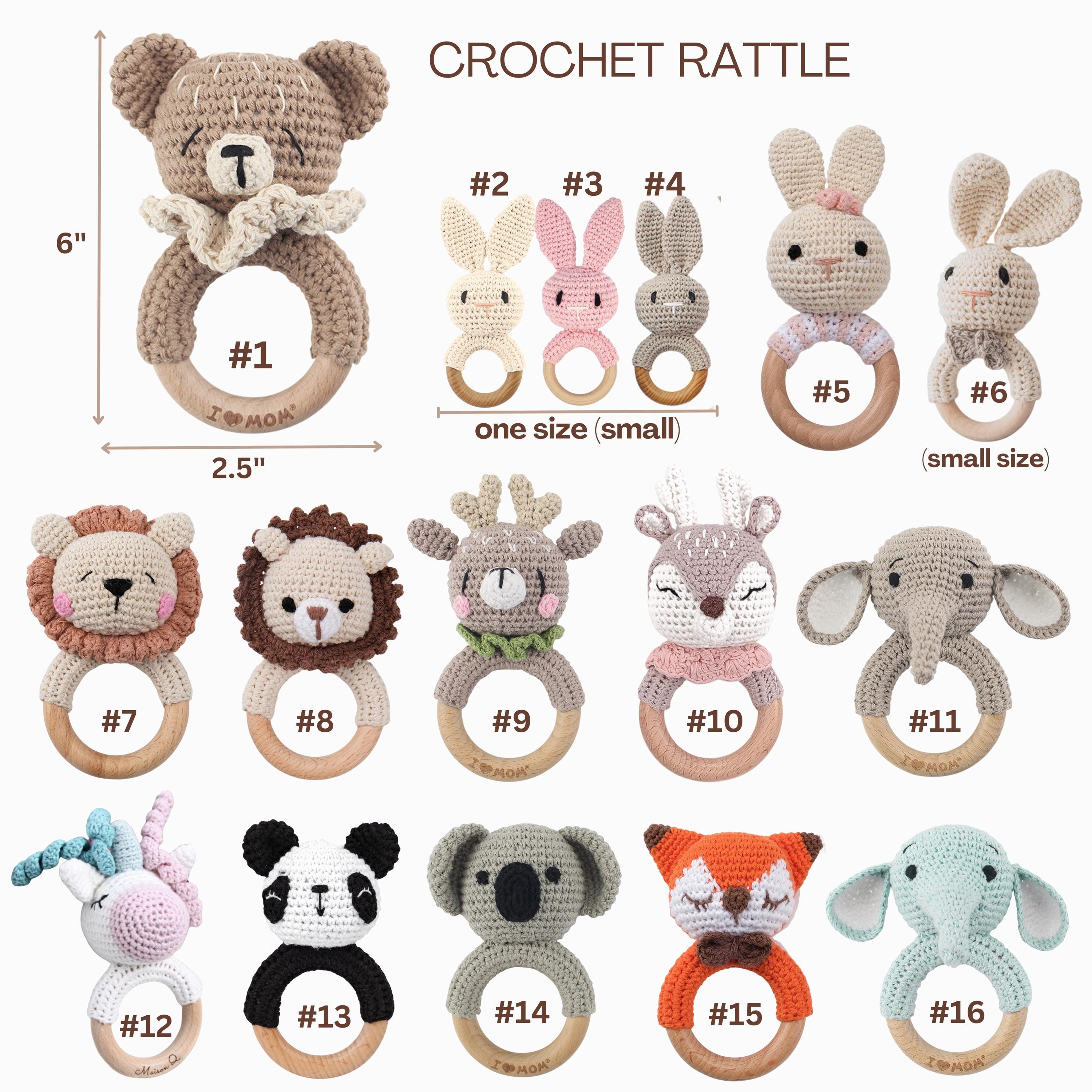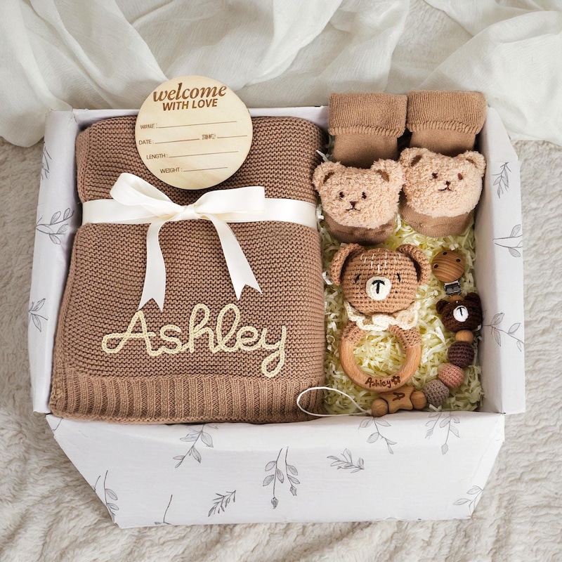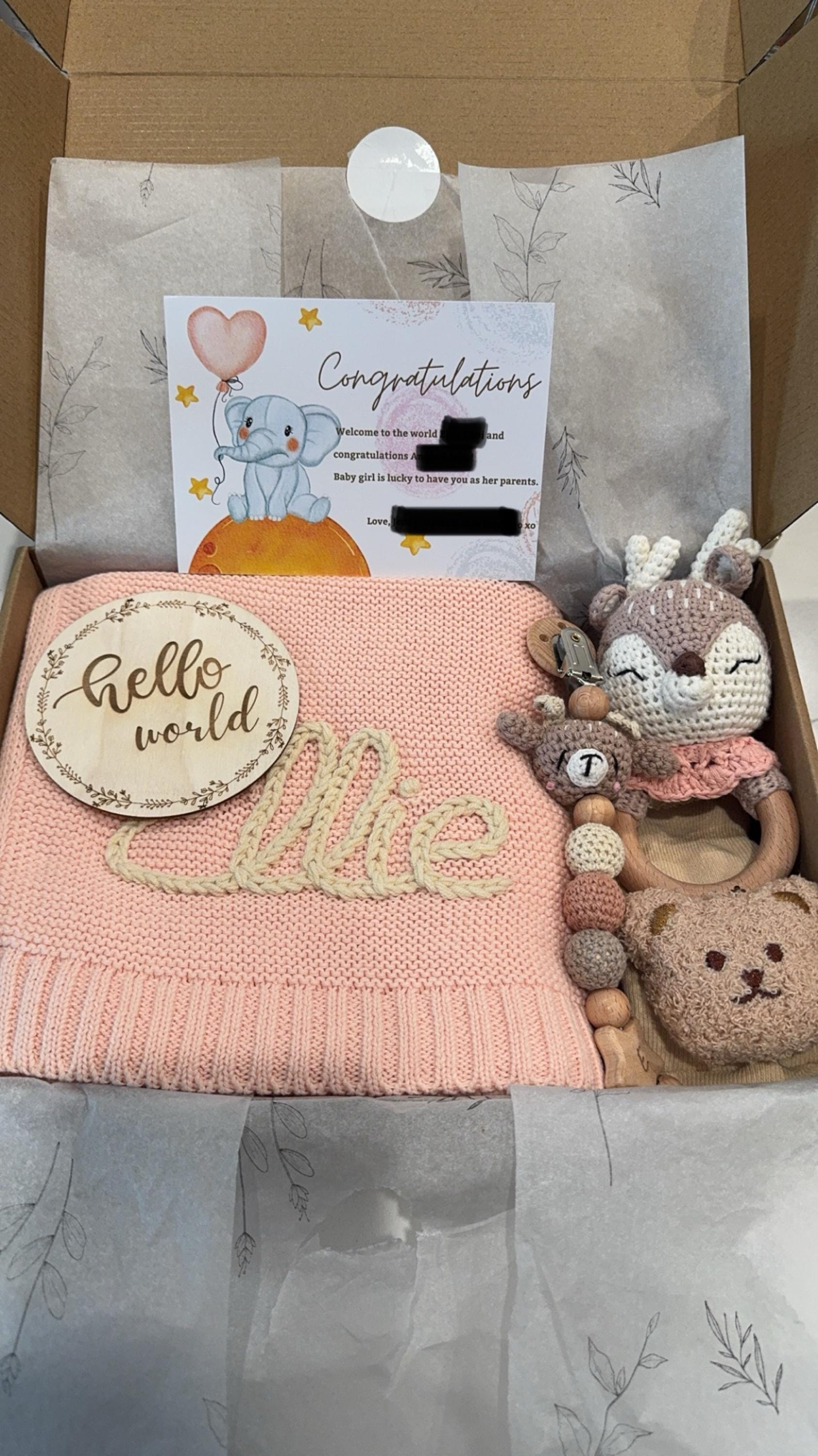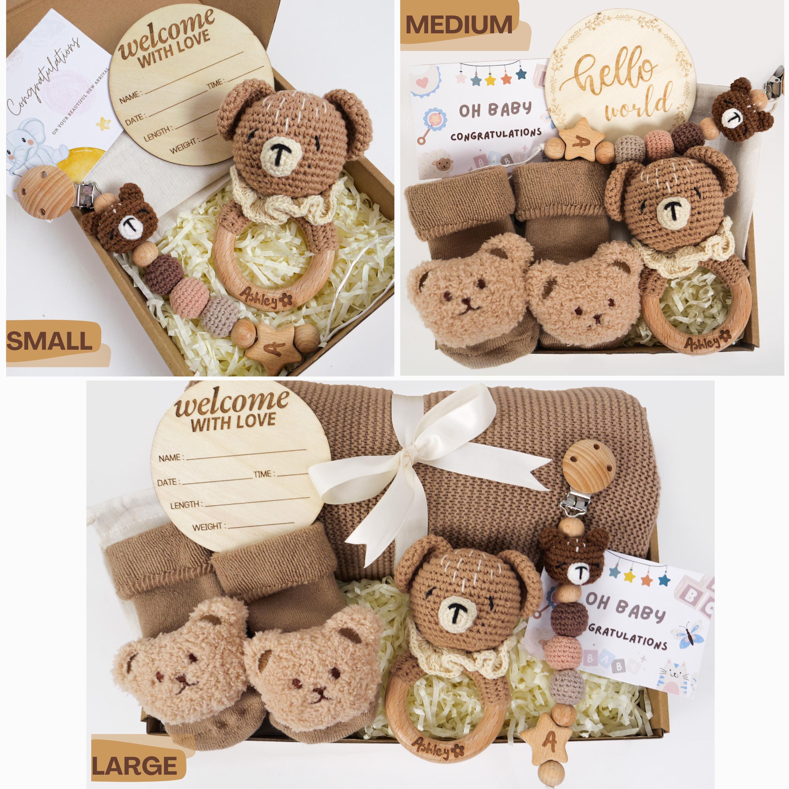 ????GROSSE GESCHENKBOX (6-teilig): • Gehäkelte Tierrassel • Gehäkelte Schnullerkette • Rutschfeste Babybär-Socken (für 0–1 Jahr) • Gestrickte Decke (76,2 x 101,6 cm) • Holztafel • Kostenlose Grußkarte