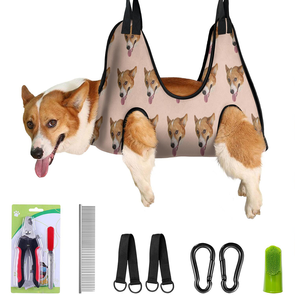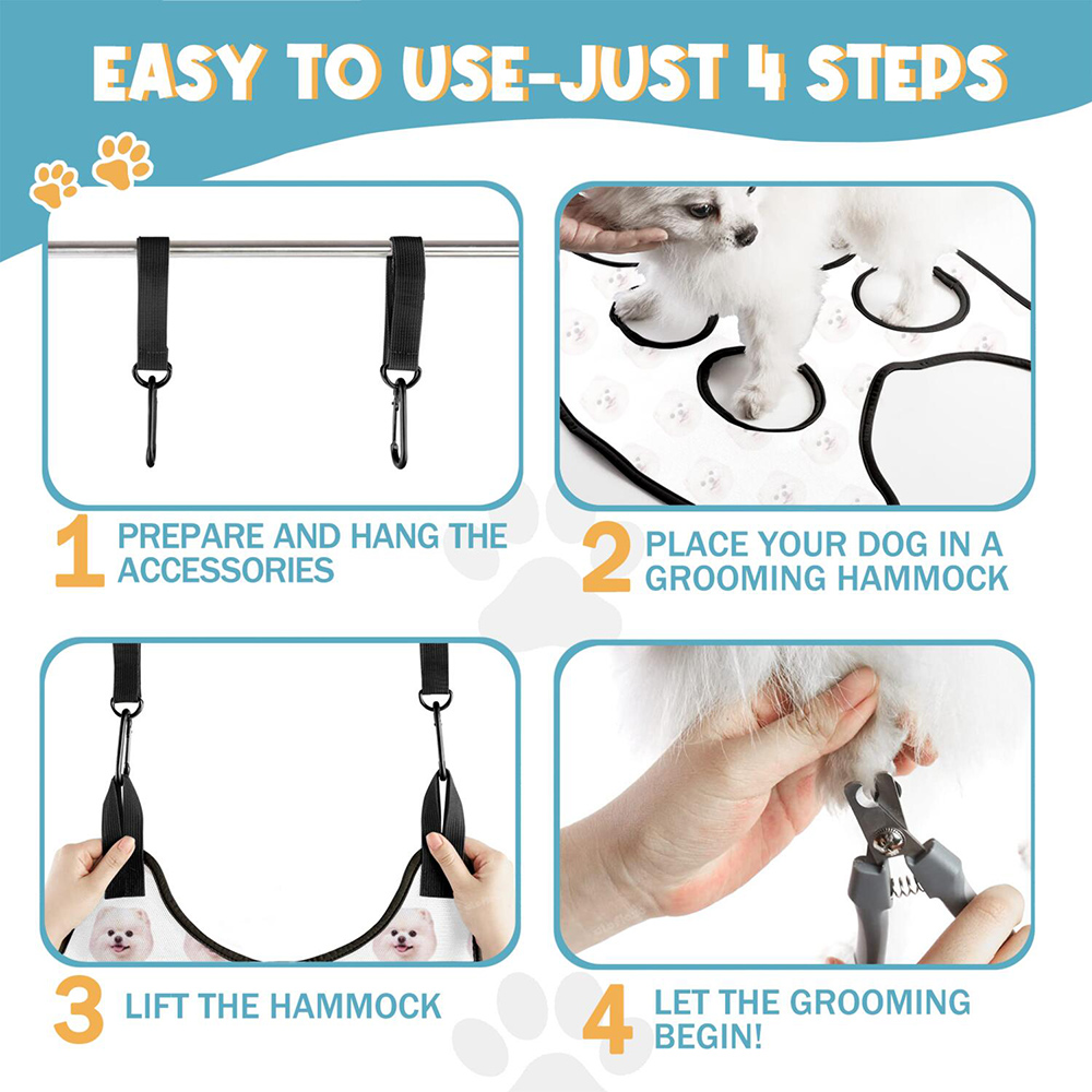 Das Zubehördesign sorgt für mehr Komfort und umfasst einen speziellen Befestigungsgurt und robuste Haken, die für Sicherheit und Stabilität der Hängematte sorgen. Die Hängematte ist so konzipiert, dass der Hund sicher fixiert ist und der Besitzer bequem Fellpflege wie Trimmen und Baden durchführen kann.