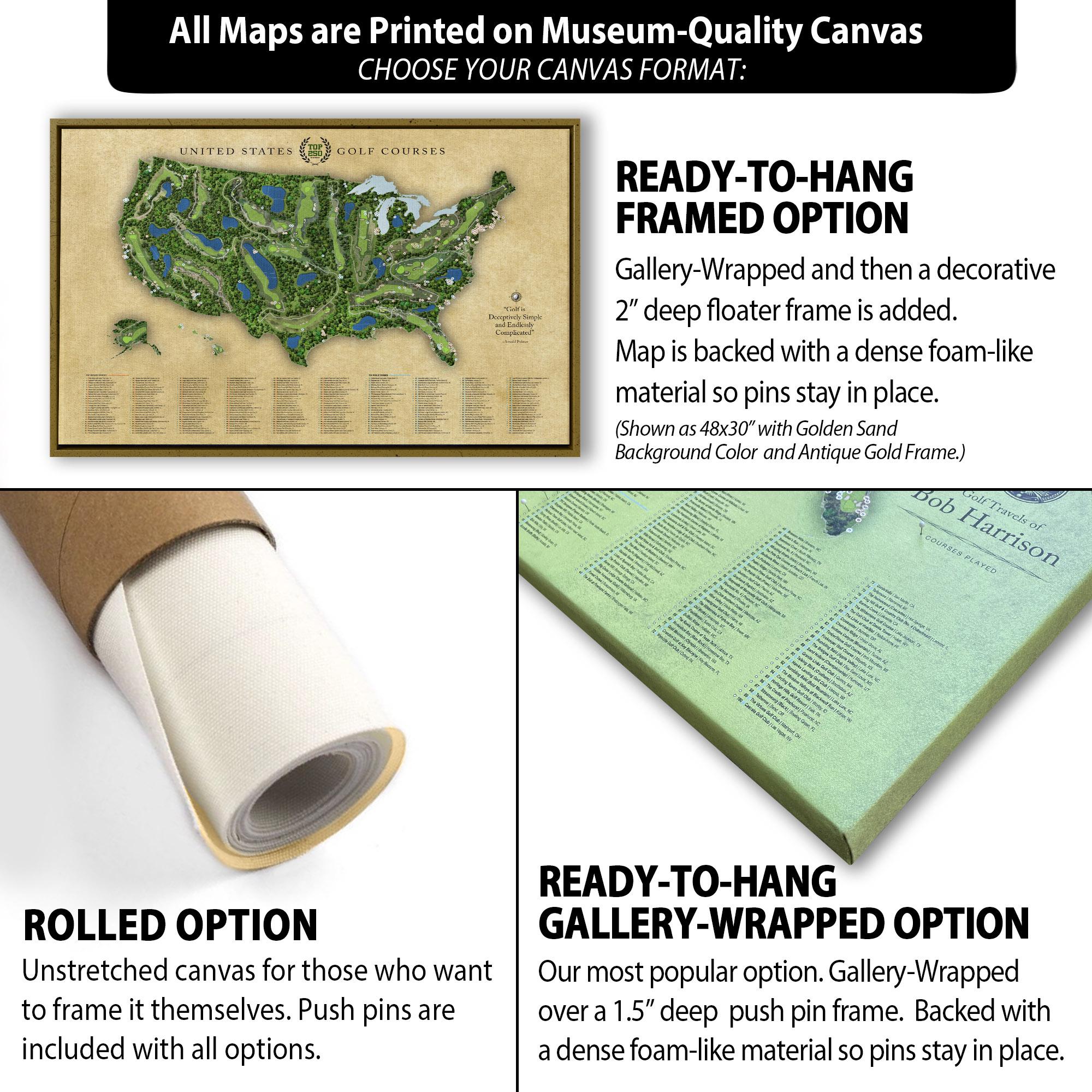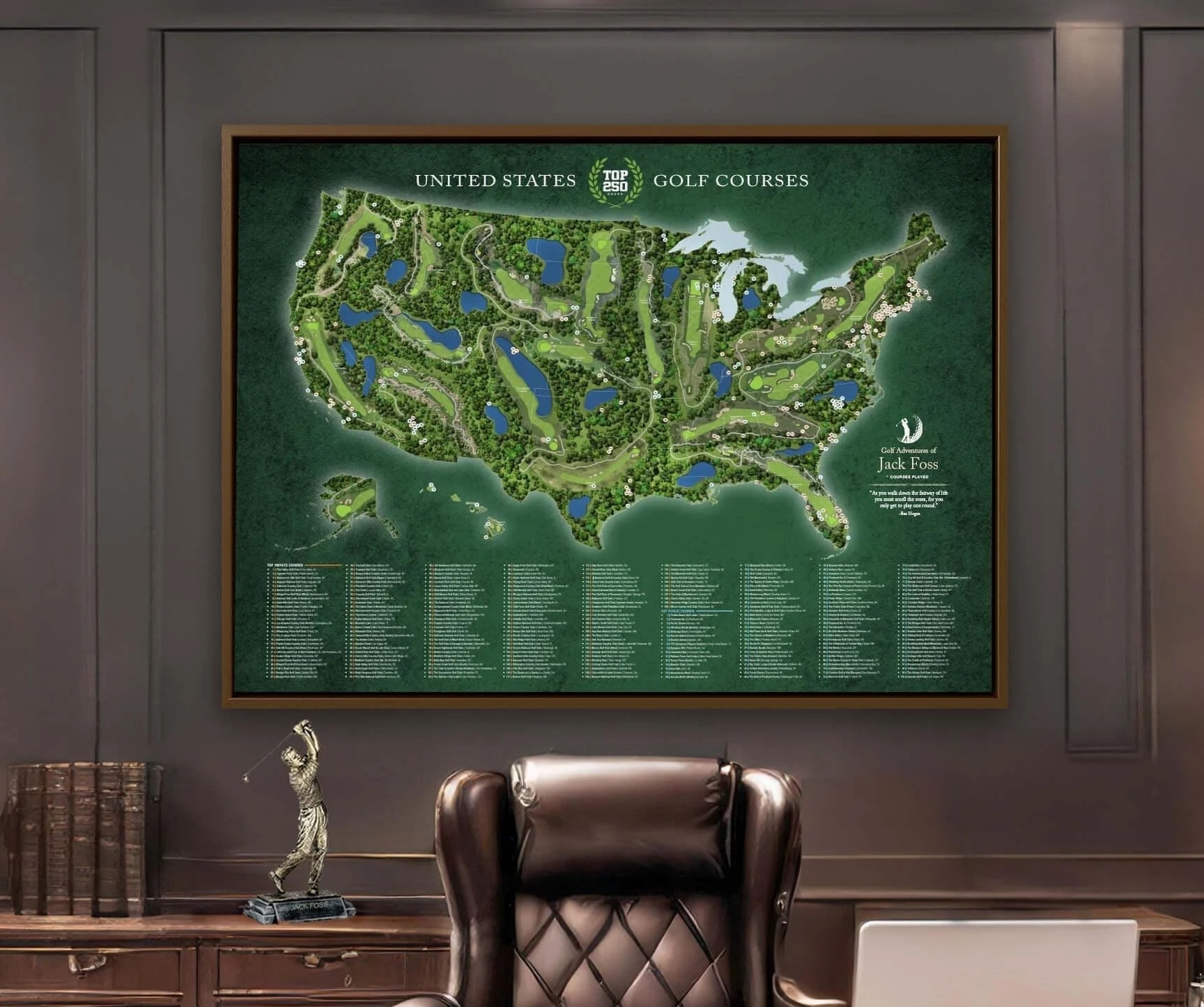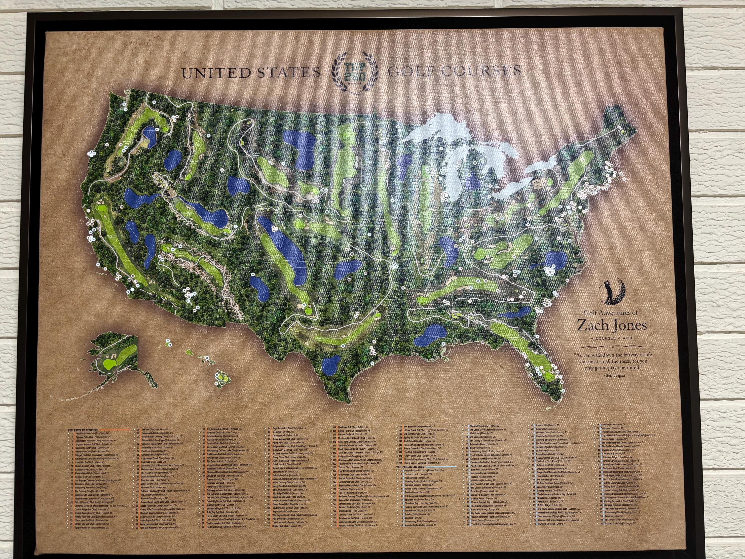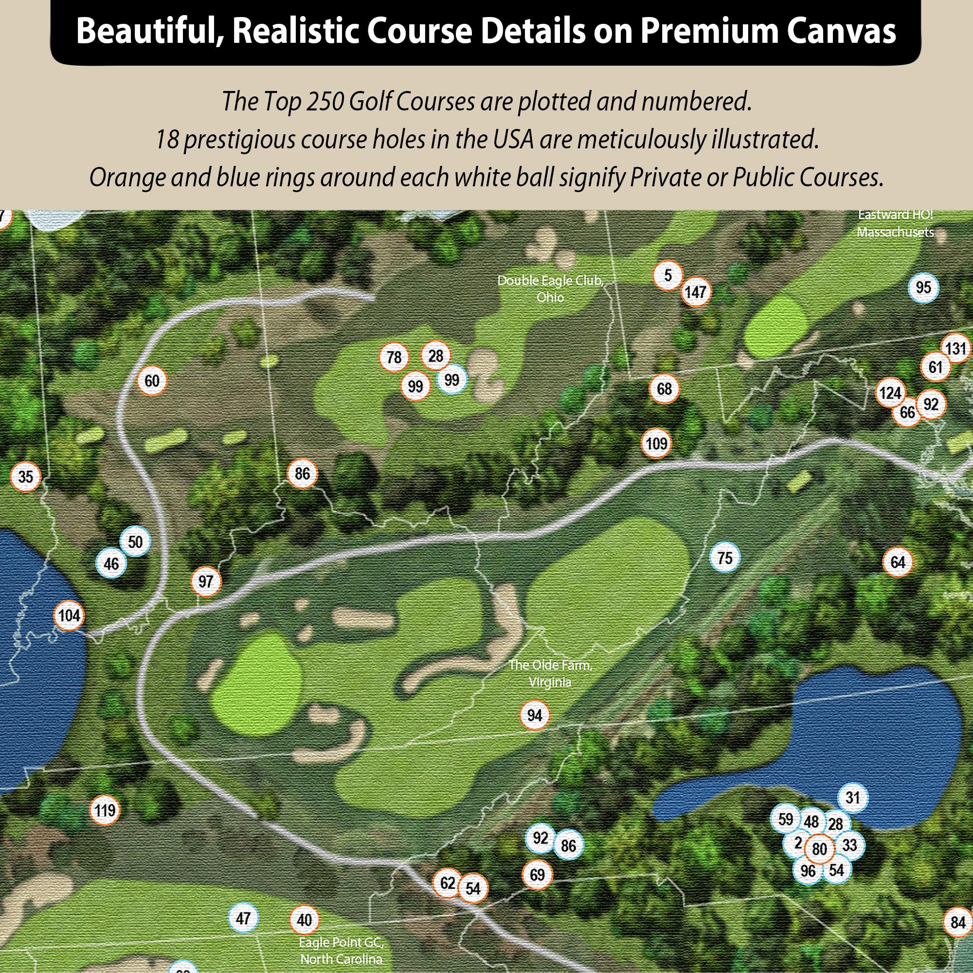 Unsere Golfplatzkarte zeigt die 250 besten Golfplätze der USA – 150 private und 100 öffentliche Plätze. Die Lage jedes Platzes ist auf der Karte eingezeichnet, die außerdem 18 der besten Golflöcher Amerikas als Hintergrund zeigt. Nutzen Sie die Karte, um gespielte Golfplätze mit weißen, golfballähnlichen Stecknadeln zu verfolgen, oder verwenden Sie diese sorgfältig gestaltete Illustration einfach als schönes Wandbild für Zuhause oder das Büro. Das perfekte Geschenk für Golfer und ein toller Gesprächsaufhänger. Erhältlich in sechs Farben, passend zu jeder Einrichtung. Hergestellt aus hochwertigem Canvas. Legenden und Zitate können kostenlos personalisiert werden, um die Karte zu einem wirklich persönlichen Geschenk zu machen! Erhältlich in den Formaten Hängefertig, gerahmt und gerollt (DIY). Hergestellt in den USA!