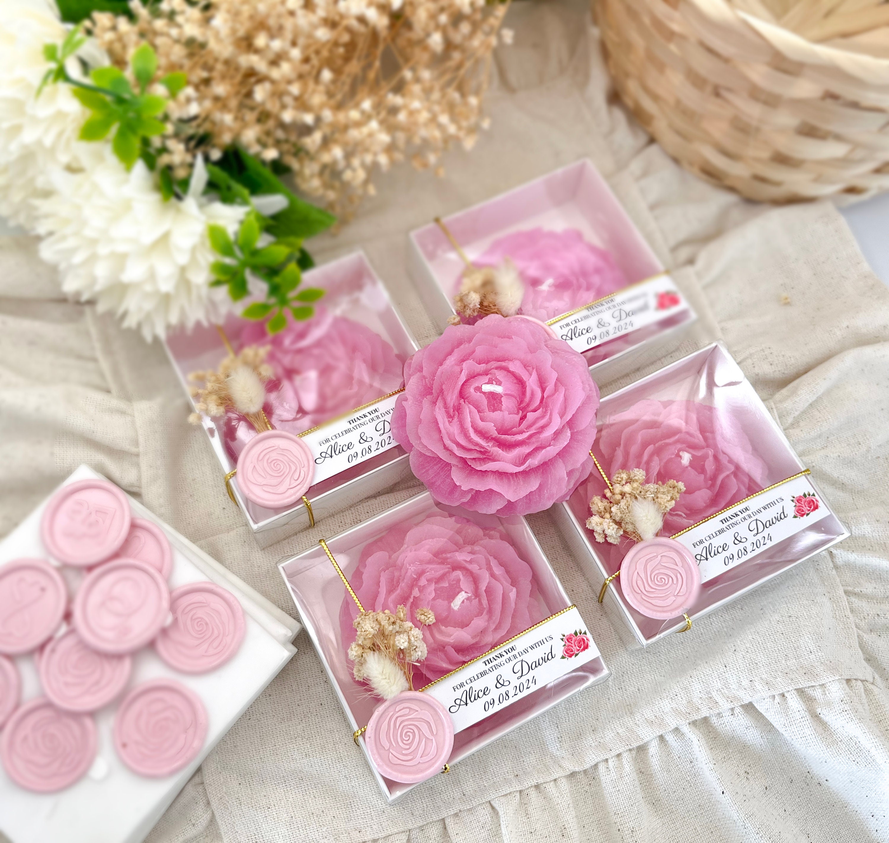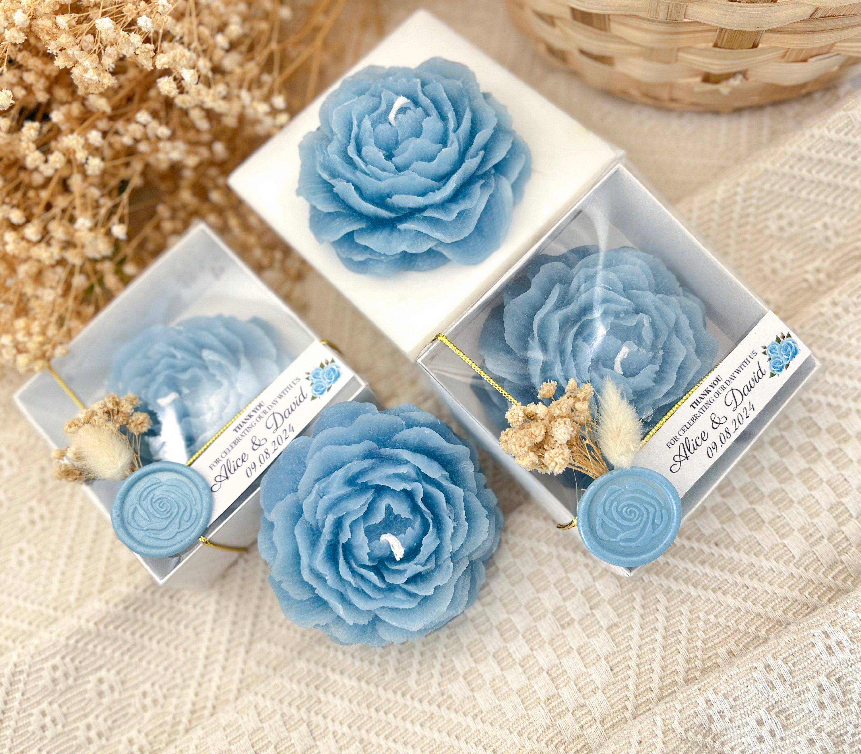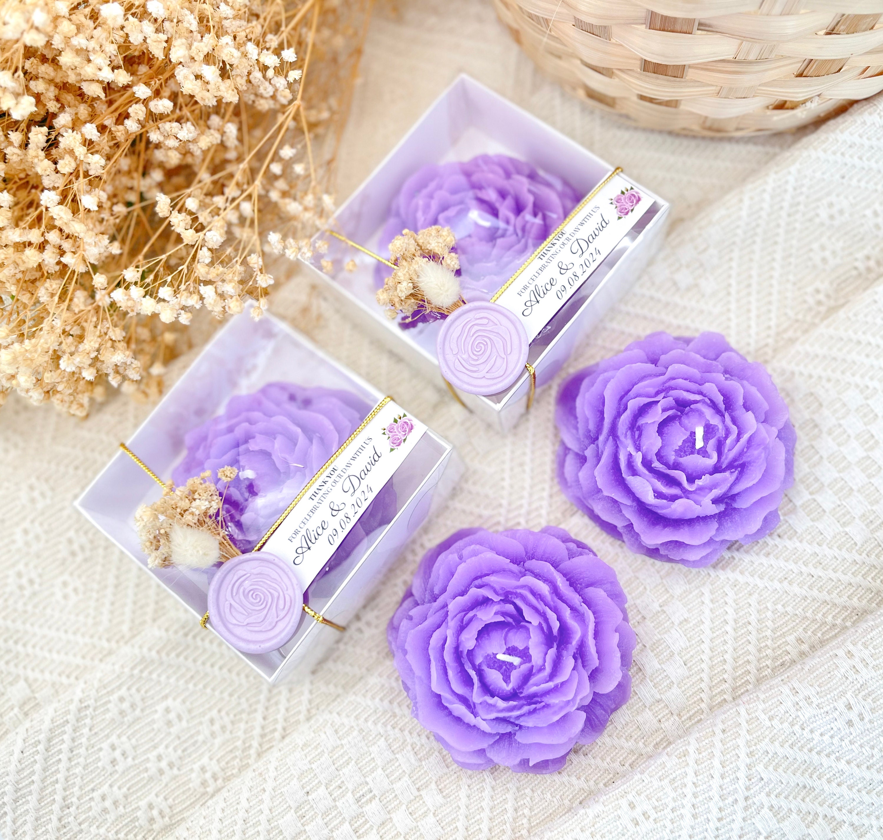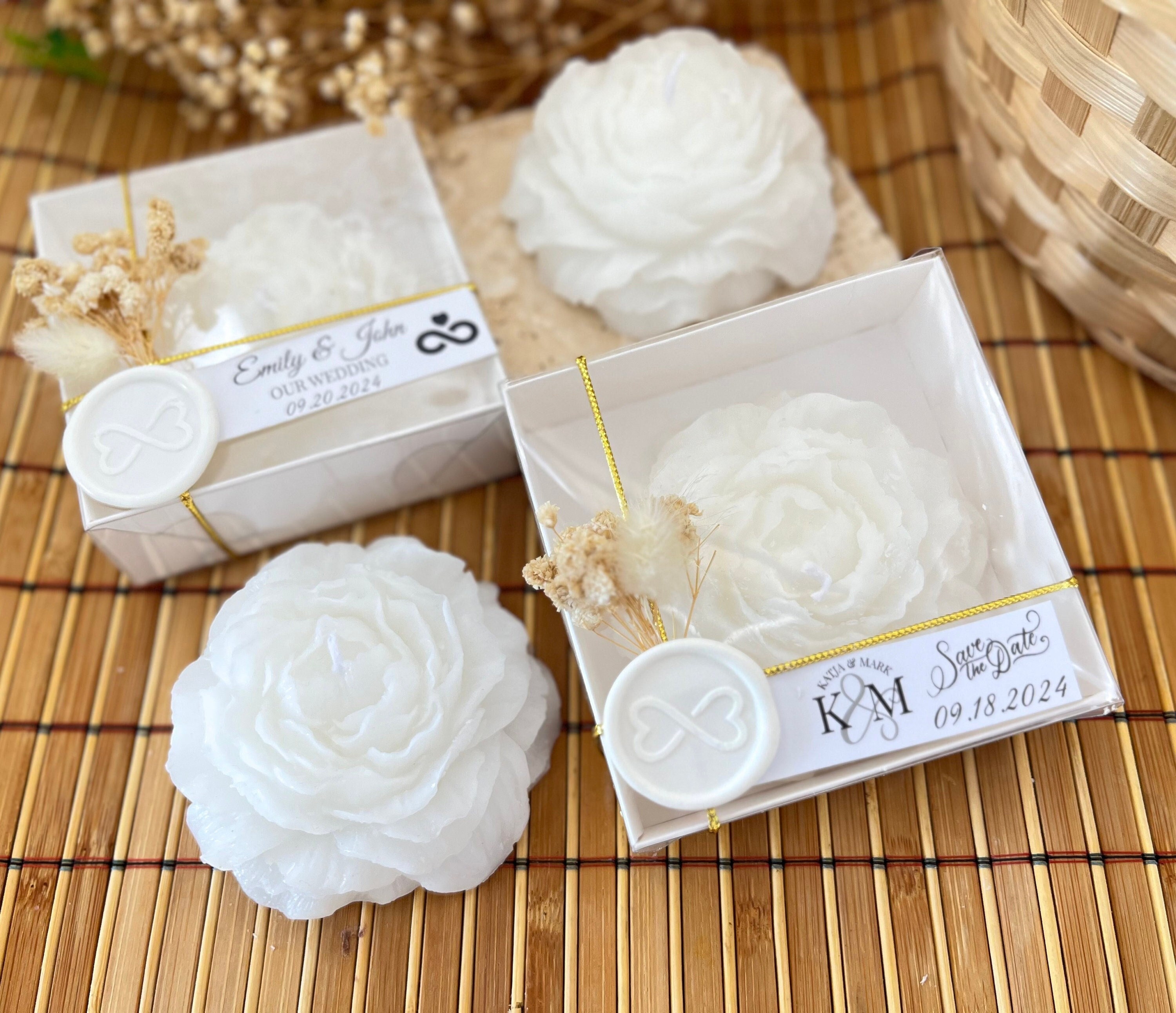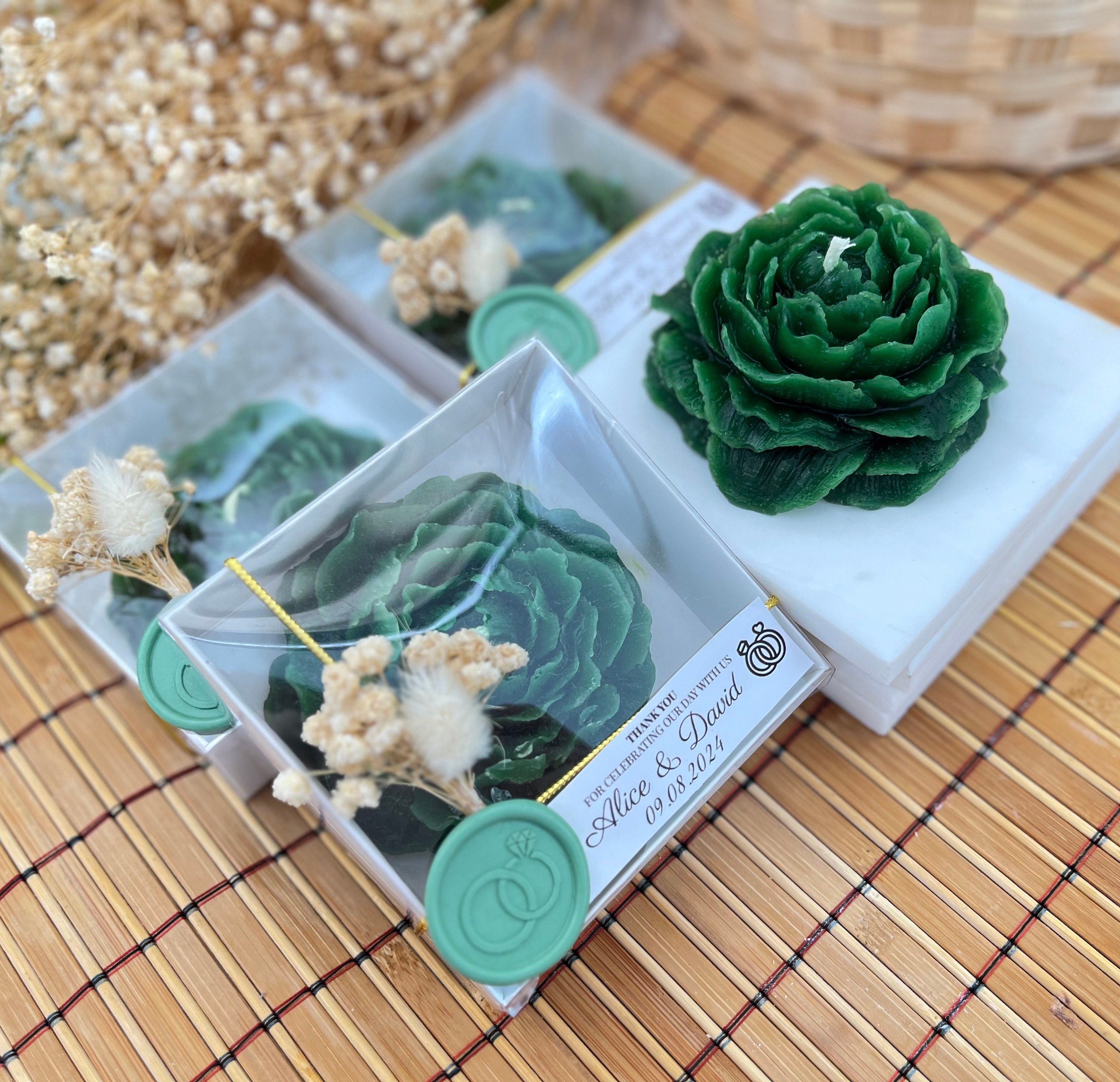 Duftkerzen und Pfingstrosenkerzen bestehen aus reinen ätherischen und phthalatfreien Duftölen, Sojawachs und Dochten aus natürlicher Baumwolle. Diese Kerzen werden von Hand gegossen. So können Sie erkennen, wie umweltfreundlich sie für Ihre Gäste sind. Wir personalisieren die Etiketten mit Ihren Namen und dem Datum Ihrer Hochzeitsfeier.
