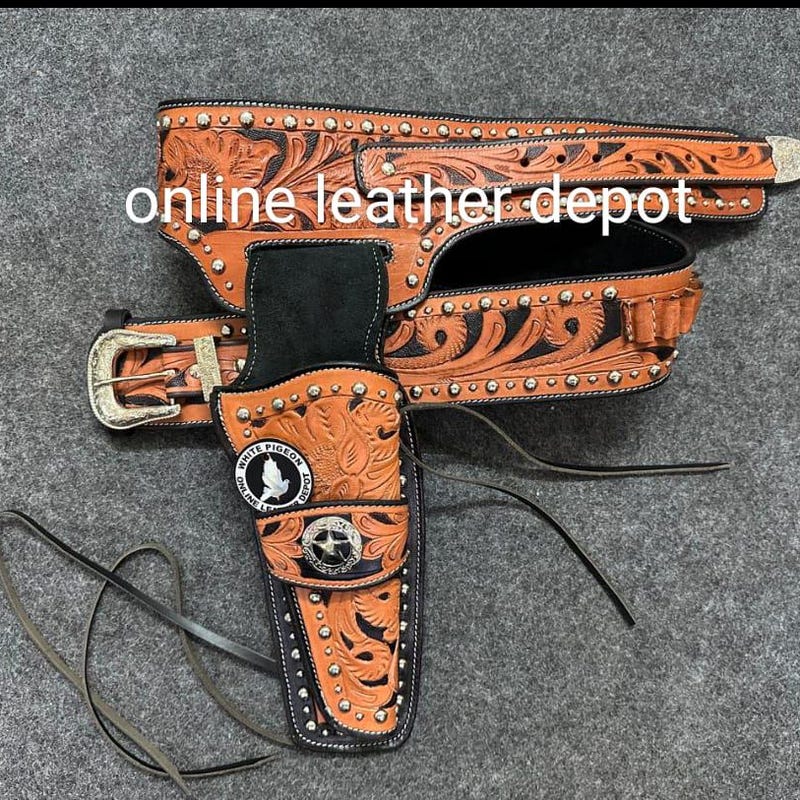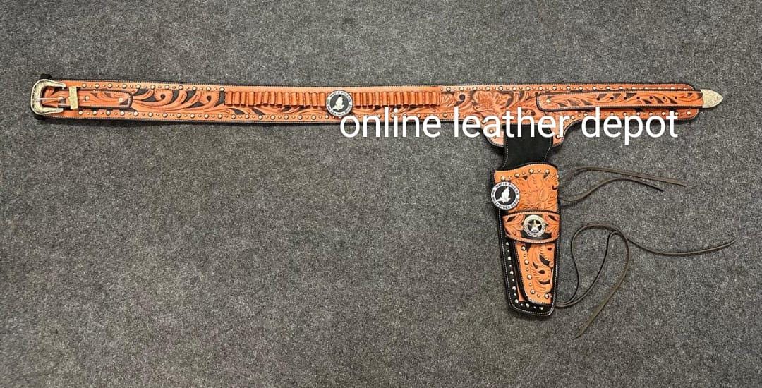 Handgefertigtes Lederholster. Hergestellt aus Herman Oak Leder. Passend für alle Revolver der Standardgrößen 357, 44 und 45. Passend für einen Revolver mit 6-Zoll-Lauf. Munitionsschlaufen für 30 Schuss.